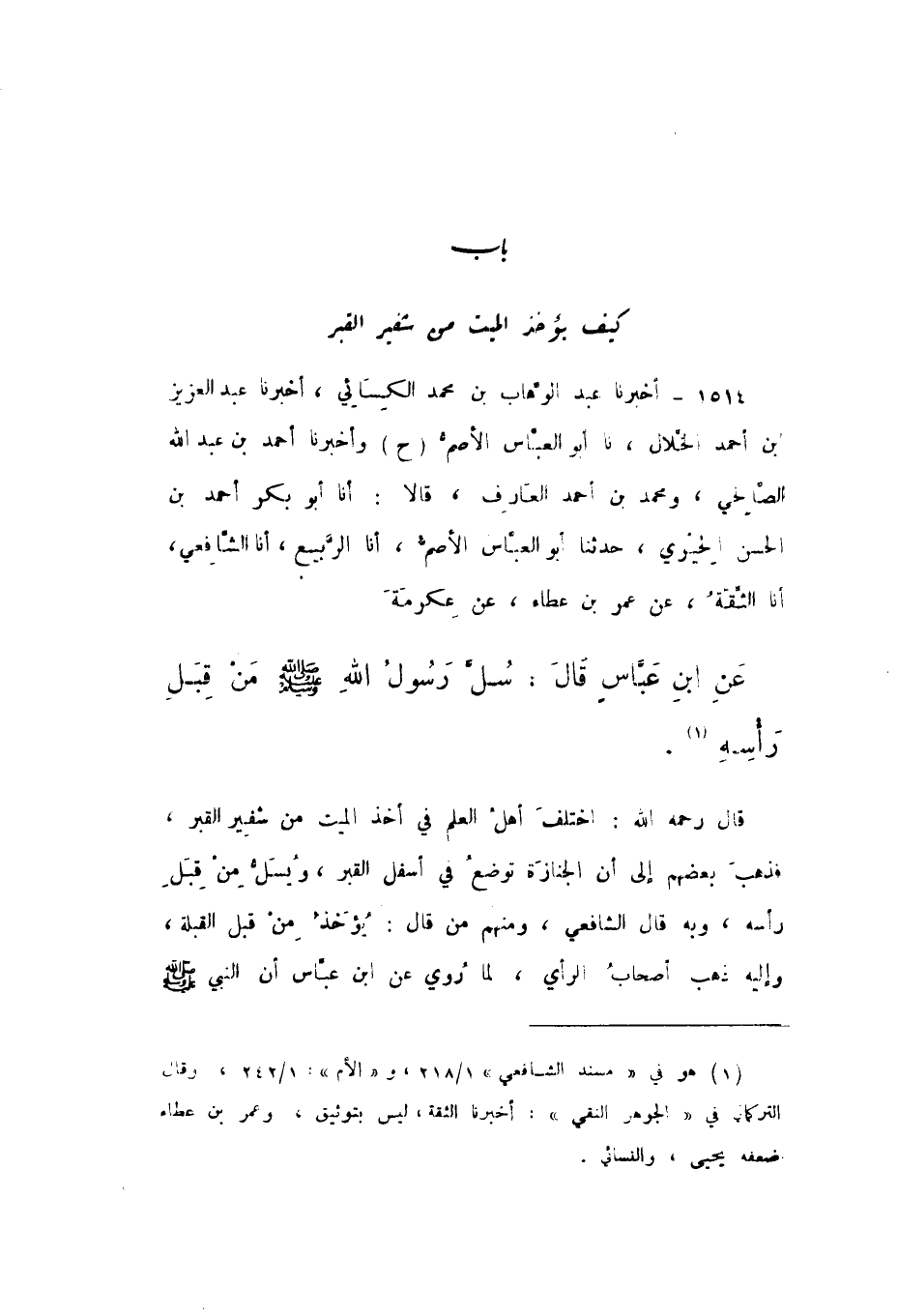 ح وَأَخْبَرَنَا أَحْمَدُ بْنُ عَبْدِ اللَّهِ الصَّالِحِيُّ، وَمُحَمَّدُ بْنُ أَحْمَدَ الْعَارِفُ، قَالا: أَنا أَبُو بَكْرٍ أَحْمَدُ بْنُ الْحَسَنِ الْحِيرِيُّ، حَدَّثَنَا أَبُو الْعَبَّاسِ الأَصَمُّ، أَنا الرَّبِيعُ، أَنا الشَّافِعِيُّ، أَنا الثِّقَةُ، عَنْ عُمَرَ بْنِ عَطَاءٍ، عَنْ عِكْرِمَةَ، عَنِ ابْنِ عَبَّاسٍ، قَالَ: «سُلَّ رَسُولُ اللَّهِ صَلَّى اللهُ عَلَيْهِ وَسَلَّمَ مَنْ قِبَلِ رَأْسِهِ»