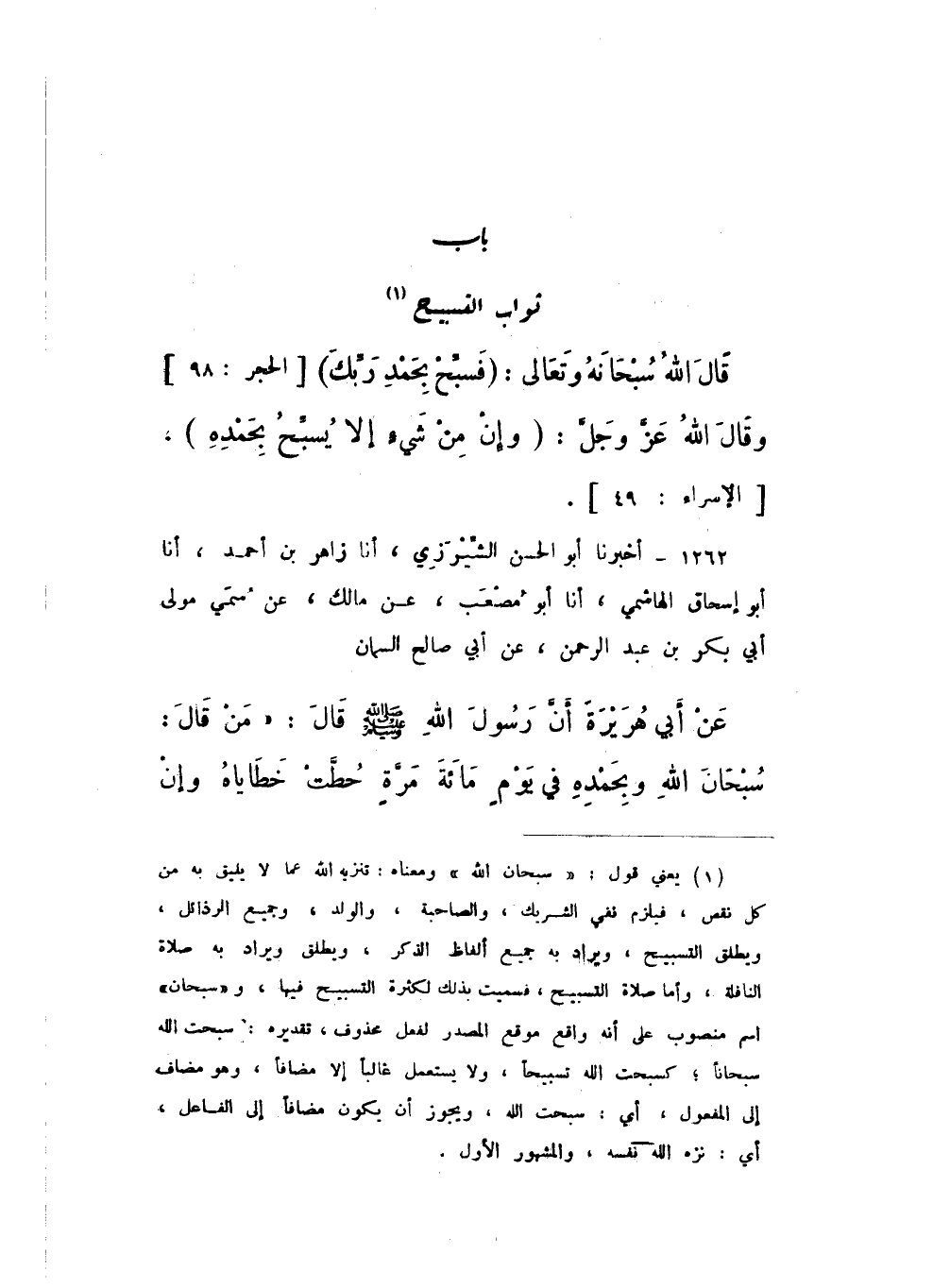 1262 - أَخْبَرَنَا أَبُو الْحَسَنِ الشَّيْرَزِيُّ، أَنا زَاهِرُ بْنُ أَحْمَدَ، أَنا أَبُو إِسْحَاقَ الْهَاشِمِيُّ، أَنا أَبُو مُصْعَبٍ، عَنْ مَالِكٍ، عَنْ سُمَيٍّ مَوْلَى أَبِي بَكْرِ بْنِ عَبْدِ الرَّحْمَنِ، عَنْ أَبِي صَالِحٍ السَّمَّانِ، عَنْ أَبِي هُرَيْرَةَ، أَنّ رَسُولَ اللَّهِ صَلَّى اللهُ عَلَيْهِ وَسَلَّمَ، قَالَ: " مَنْ قَالَ: سُبْحَانَ اللَّهِ وَبِحَمْدِهِ فِي يَوْمٍ مِائَةَ مَرَّةٍ حُطَّتْ خَطَايَاهُ وَإِنْ