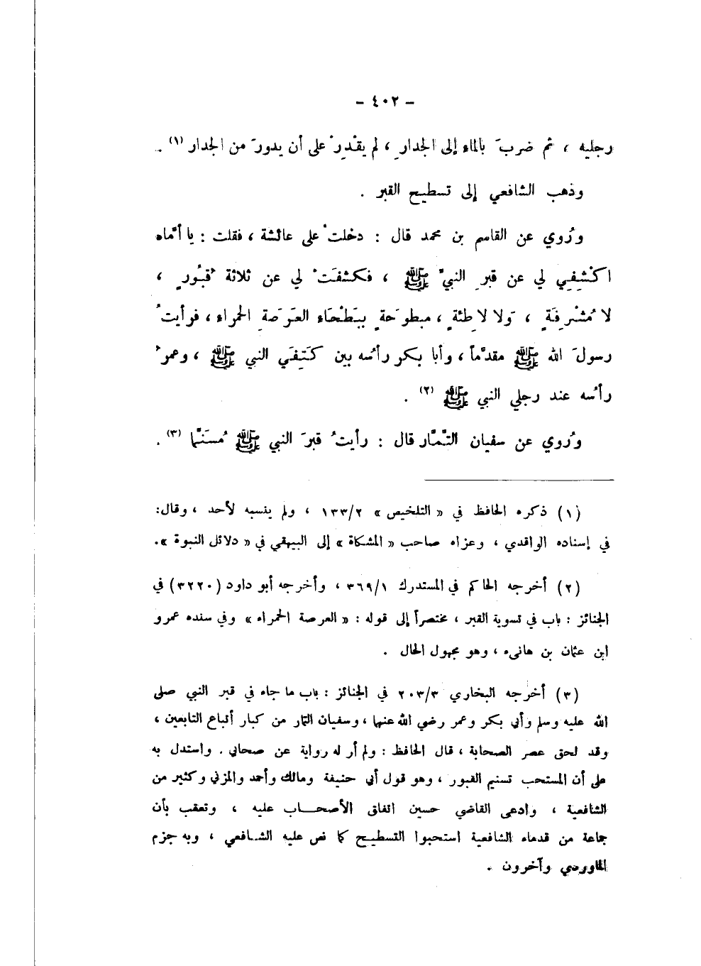 وَرُوِيَ عَنِ الْقَاسِمِ بْنِ مُحَمَّدٍ، قَالَ: دَخَلْتُ عَلَى عَائِشَةَ، فَقُلْتُ: يَا أُمَّاهُ اكْشِفِي لِي عَنْ قَبْرِ النَّبِيِّ صَلَّى اللهُ عَلَيْهِ وَسَلَّمَ، فَكَشَفَتْ لِي عَنْ ثَلاثَةِ قُبُورٍ، لَا مُشْرِفَةٍ، وَلا لاطِئَةٍ، مَبْطُوحَةٍ بِبَطْحَاءِ الْعَرْصَةِ الْحَمْرَاءِ، فَرَأَيْتُ رَسُولَ اللَّهِ صَلَّى اللهُ عَلَيْهِ وَسَلَّمَ مُقَدَّمًا، وَأَبَا بَكْرٍ رَأْسُهُ بَيْنَ كَتِفَيِ النَّبِيِّ صَلَّى اللهُ عَلَيْهِ وَسَلَّمَ، وَعُمَرُ رَأْسُهُ عِنْدَ رِجْلَيِ النَّبِيِّ صَلَّى اللهُ عَلَيْهِ وَسَلَّمَ.