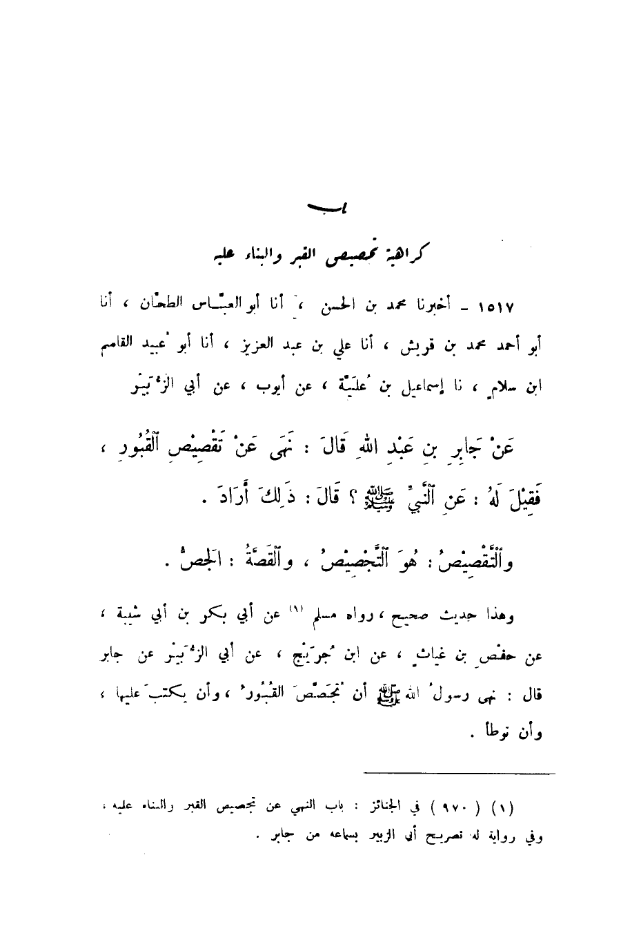 1517 - أَخْبَرَنَا مُحَمَّدُ بْنُ الْحَسَنِ، أَنا أَبُو الْعَبَّاسِ الطَّحَّانُ، أَنا أَبُو أَحْمَدَ مُحَمَّدُ بْنُ قُرَيْشٍ، أَنا عَلِيُّ بْنُ عَبْدِ الْعَزِيزِ، أَنا أَبُو عُبَيْدٍ الْقَاسِمُ بْنُ سَلامٍ، نَا إِسْمَاعِيلُ بْنُ عُلَيَّةَ، عَنْ أَيُّوبَ، عَنْ أَبِي الزُّبَيْرِ، عَنْ جَابِرِ بْنِ عَبْدِ اللَّهِ، قَالَ: «نَهَى عَنْ تَقْصِيصِ الْقُبُورِ»، فَقِيلَ لَهُ: عَنِ النَّبِيِّ صَلَّى اللهُ عَلَيْهِ وَسَلَّمَ؟ قَالَ: ذَلِكَ أَرَادَ.