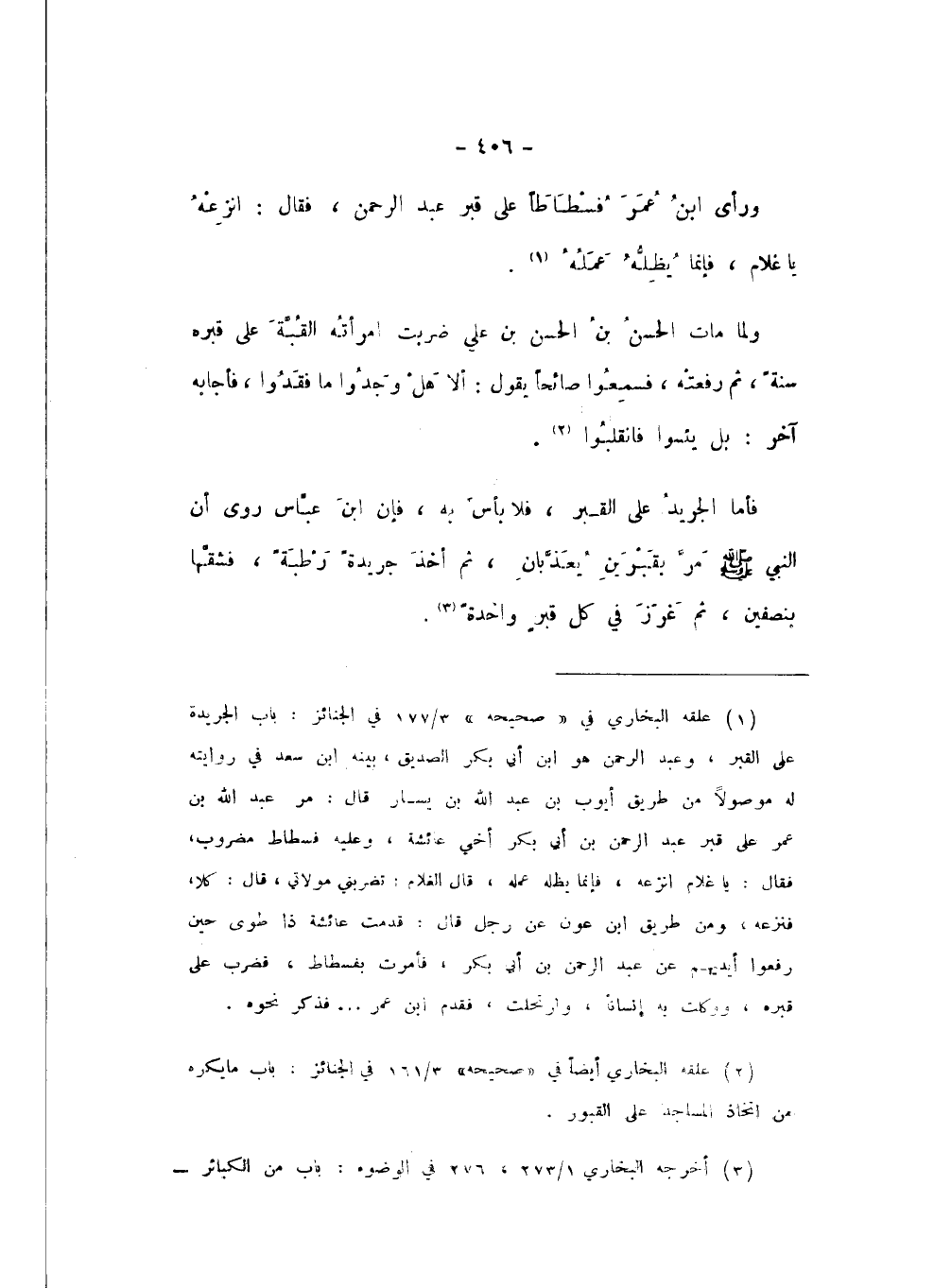 فَأَمَّا الْجَرِيدُ عَلَى الْقَبْرِ، فَلا بَأْسَ بِهِ، فَإِنَّ ابْنَ عَبَّاسٍ، رَوَى أَنَّ النَّبِيَّ صَلَّى اللهُ عَلَيْهِ وَسَلَّمَ «مَرَّ بِقَبْرَيْنِ يُعَذَّبَانِ، ثُمَّ أَخَذَ جَرِيدَةً رَطْبَةً فَشَقَّهَا بِنِصْفَيْنِ، ثُمَّ غَرَزَ فِي كُلِّ قَبْرٍ وَاحِدَةً».