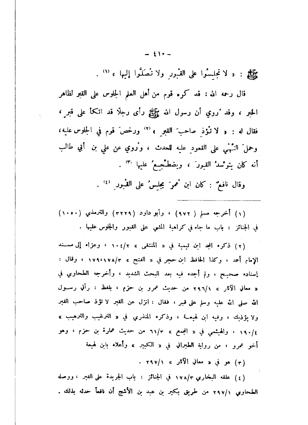 قَالَ رَحِمَهُ اللَّهُ: قَدْ كَرِهَ قَوْمٌ مِنْ أَهْلِ الْعِلْمِ الْجُلُوسَ عَلَى الْقَبْرِ لِظَاهِرِ الْخَبَرِ، وَقَدْ رُوِيَ أَنَّ رَسُولَ اللَّهِ صَلَّى اللهُ عَلَيْهِ وَسَلَّمَ رَأَى رَجُلا قَدِ اتَّكَأَ عَلَى قَبْرٍ، فَقَالَ لَهُ: «لَا تُؤْذِ صَاحِبَ الْقَبْرِ»، وَرَخَّصَ قَوْمٌ فِي الْجُلُوسِ عَلَيْهِ، وَحَمْلُ النَّهْيِ عَلَى الْقُعُودِ عَلَيْهِ لِلْحَدَثِ، وَرُوِيَ عَنْ عَلِيِّ بْنِ أَبِي طَالِبٍ، أَنَّهُ كَانَ يَتَوَسَّدُ الْقُبُورَ، وَيَضْطَجِعُ عَلَيْهَا.