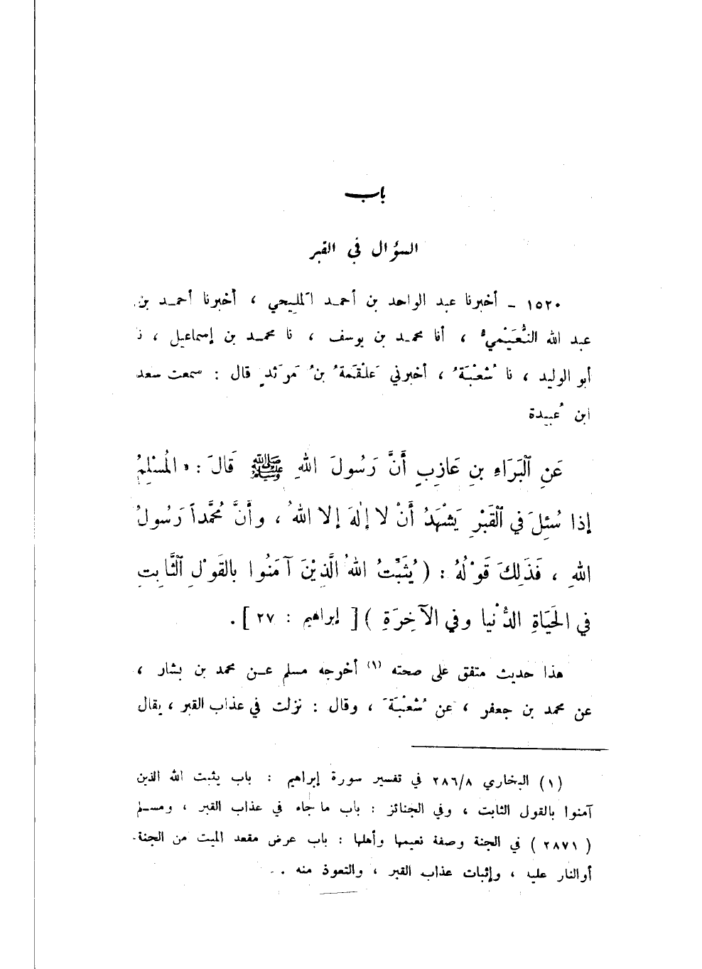 1520 - أَخْبَرَنَا عَبْدُ الْوَاحِدِ بْنُ أَحْمَدَ الْمَلِيحِيُّ، أَخْبَرَنَا أَحْمَدُ بْنُ عَبْدِ اللَّهِ النُّعَيْمِيُّ، أَنا مُحَمَّدُ بْنُ يُوسُفَ، نَا مُحَمَّدُ بْنُ إِسْمَاعِيلَ، نَا أَبُو الْوَلِيدِ، نَا شُعْبَةُ، أَخْبَرَنِي عَلْقَمَةُ بْنُ مَرْثَدٍ، قَالَ: سَمِعْتُ سَعْدَ بْنَ عُبَيْدَةَ، عَنِ الْبَرَاءِ بْنِ عَازِبٍ، أَنّ رَسُولَ اللَّهِ صَلَّى اللهُ عَلَيْهِ وَسَلَّمَ، قَالَ: " الْمُسْلِمُ إِذَا سُئِلَ فِي الْقَبْرِ يَشْهَدُ أَنْ لَا إِلَهَ إِلا اللَّهُ، وَأَنَّ مُحمَّدًا رَسُولُ اللَّهِ، فَذَلِكَ قَوْلُهُ: {يُثَبِّتُ اللَّهُ الَّذِينَ آمَنُوا بِالْقَوْلِ الثَّابِتِ فِي الْحَيَاةِ الدُّنْيَا وَفِي الآخِرَةِ} [إِبْرَاهِيم: 27] ".