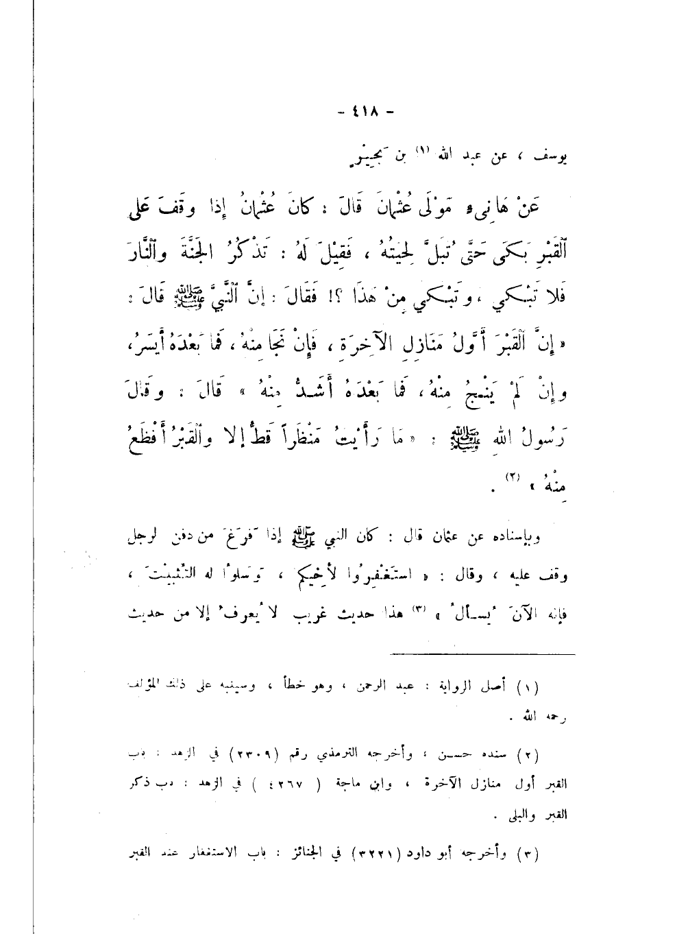 يُوسُفَ، عَنْ عَبْدِ اللَّهِ بْنِ بَحِيرٍ، عَنْ هَانِئٍ مَوْلَى عُثْمَانَ، قَالَ: كانَ عُثْمَانُ إِذَا وَقَفَ عَلَى الْقَبْرِ بَكَى حَتَّى تُبَلَّ لِحْيَتُهُ، فَقِيلَ لَهُ، تَذْكُرُ الْجَنَّةَ وَالنَّارَ فَلا تَبْكِي، وَتَبْكِي مِنْ هَذَا؟! فَقَالَ: إِنَّ النَّبِيَّ صَلَّى اللهُ عَلَيْهِ وَسَلَّمَ، قَالَ: «إِنَّ الْقَبْرَ أَوَّلُ مَنَازِلِ الآخِرَةِ، فَإِنْ نَجَا مِنْهُ، فَمَا بَعْدَهُ أَيْسَرُ، وَإِنْ لَمْ يَنْجُ مِنْهُ، فَمَا بَعْدَهُ أَشَدُّ مِنْهُ»