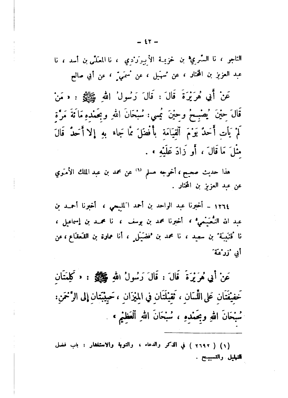 التَّاجِرُ، نَا السَّرِيُّ بْنُ خُزَيْمَةَ الأَبِيوَرْدِيُّ، نَا الْمُعَلَّى بْنُ أَسَدٍ، نَا عَبْدُ الْعَزِيزِ بْنُ الْمُخْتَارِ، عَنْ سُهَيْلٍ، عَنْ سُمَيٍّ، عَنْ أَبِي صَالِحٍ، عَنْ أَبِي هُرَيْرَةَ، قَالَ: قَالَ رَسُولُ اللَّهِ صَلَّى اللهُ عَلَيْهِ وَسَلَّمَ: " مَنْ قَالَ حِينَ يُصْبِحُ، وَحِينَ يُمْسِي: سُبْحَانَ اللَّهِ وَبِحَمْدِهِ مِائَةَ مَرَّةٍ لَمْ يَأْتِ أَحَدٌ يَوْمَ الْقِيَامَةِ بِأَفْضَلَ مِمَّا جَاءَ بِهِ إِلا أَحَدٌ قَالَ مِثْلَ مَا قَالَ، أَوْ زَادَ عَلَيْهِ ".