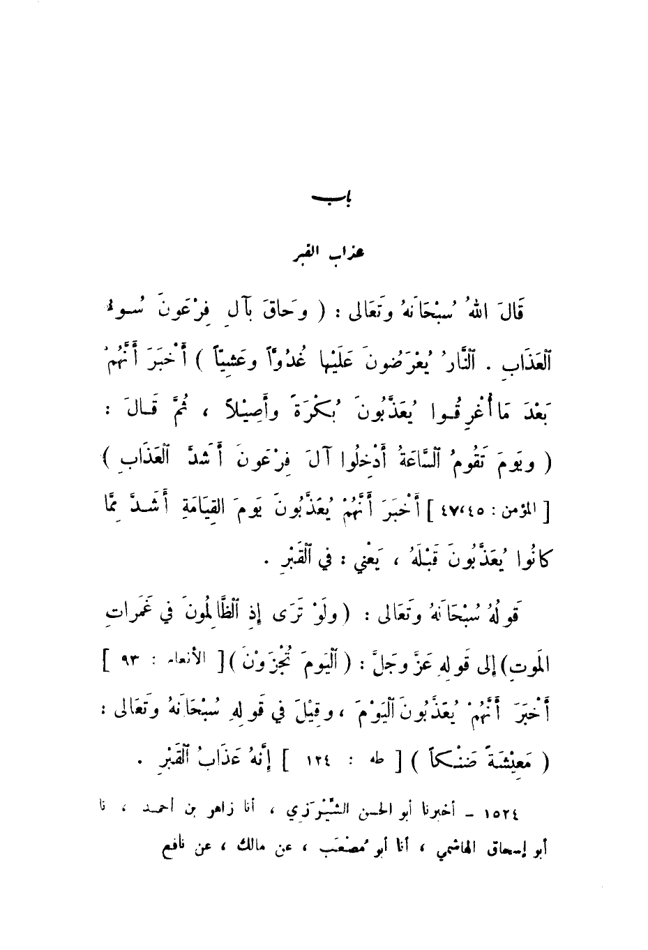1524 - أَخْبَرَنَا أَبُو الْحَسَنِ الشِّيرَزِيُّ، أَنا زَاهِرُ بْنُ أَحْمَدَ، نَا أَبُو إِسْحَاقَ الْهَاشِمِيُّ، أَنا أَبُو مُصْعَبٍ، عَنْ مَالِكٍ، عَنْ نَافِعٍ،