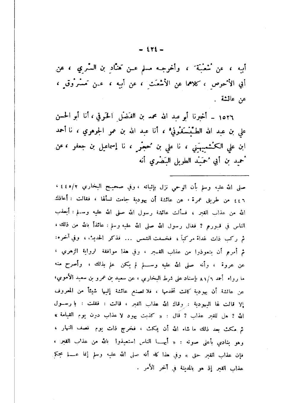 1526 - أَخْبَرَنَا أَبُو عَبْدِ اللَّهِ مُحَمَّدُ بْنُ الْفَضْلِ الْخِرَقِيُّ، أَنا أَبُو الْحَسَنِ عَلِيُّ بْنُ عَبْدِ اللَّهِ الطَّيْسَفُونِيُّ، أَنا عَبْدُ اللَّهِ بْنُ عُمَرَ الْجَوْهَرِيُّ، نَا أَحْمَدُ بْنُ عَلِيٍّ الْكُشْمِيهَنِيُّ، نَا عَلِيُّ بْنُ حُجْرٍ، نَا إِسْمَاعِيلُ بْنُ جَعْفَرٍ، عَنْ حُمَيْدِ بْنِ أَبِي حُمَيْدٍ الطَّوِيلُ الْبَصْرِيُّ، أَنَّهُ