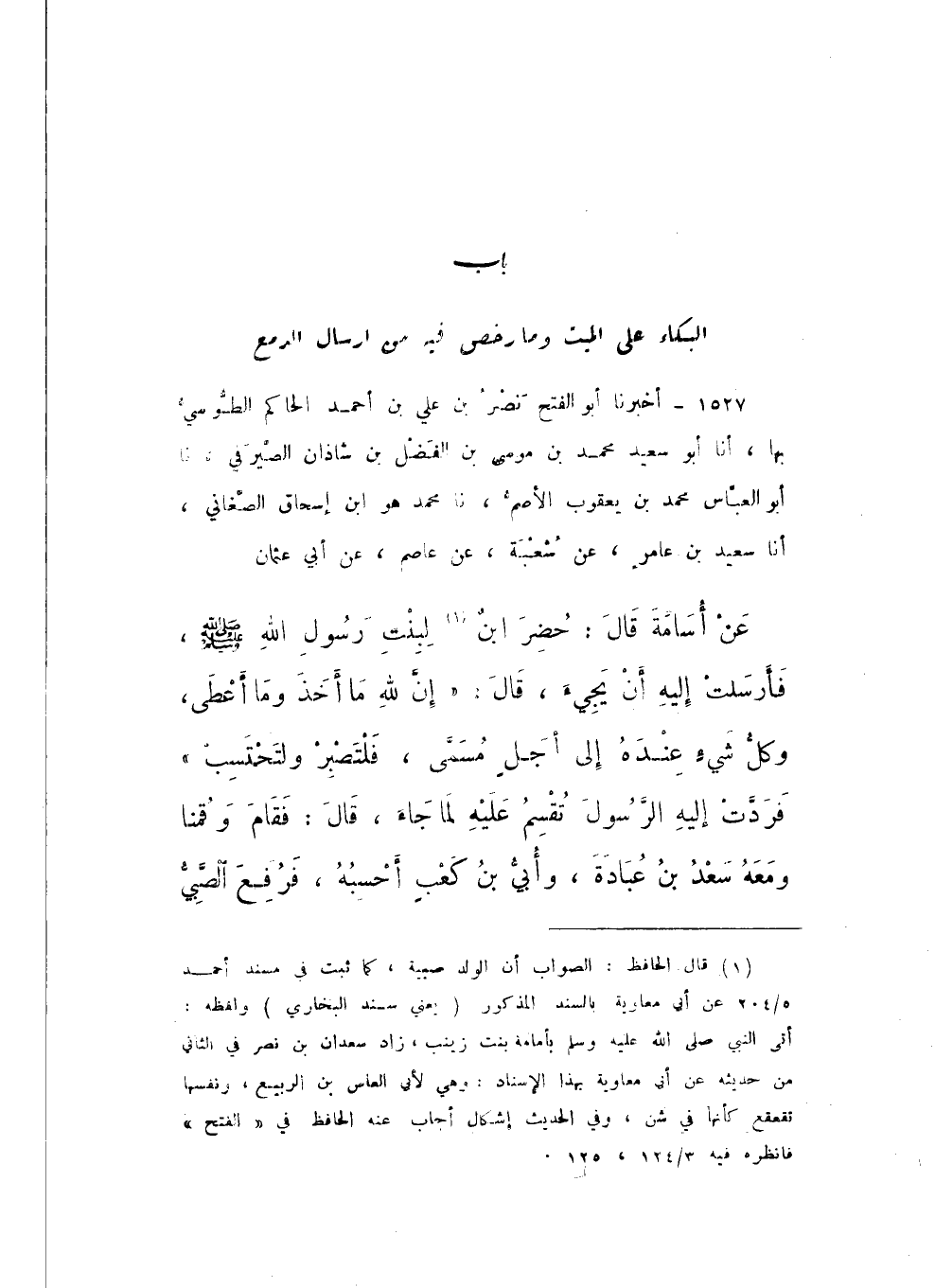 1527 - أَخْبَرَنَا أَبُو الْفَتْحِ نَصْرُ بْنُ عَلِيِّ بْنِ أَحْمَدَ الْحَاكِمُ الطُّوسِيُّ، بِهَا، أَنا أَبُو سَعِيدٍ مُحَمَّدُ بْنُ مُوسَى بْنِ الْفَضْلِ بْنِ شَاذَانَ الصَّيْرَفِيُّ، نَا أَبُو الْعَبَّاسِ مُحَمَّدُ بْنُ يَعْقُوبَ الأَصَمُّ، نَا مُحَمَّدٌ هُوَ ابْنُ إِسْحَاقَ الصَّغَانِيُّ، أَنا سَعِيدُ بْنُ عَامِرٍ، عَنْ شُعْبَةَ، عَنْ عَاصِمٍ، عَنْ أَبِي عُثْمَانَ، عَنْ أُسَامَةَ، قَالَ: حُضِرَ ابنٌ لِبِنْتِ رَسُولِ اللَّهِ صَلَّى اللهُ عَلَيْهِ وَسَلَّمَ فَأَرْسَلَتْ إِلَيْهِ أَنْ يَجِيءَ، قَالَ: «إِنَّ لِلَّهِ مَا أَخَذَ وَمَا أَعْطَى، وَكُلُّ شَيْءٍ عِنْدَهُ إِلَى أجَلٍ مُسَمًّى، فَلْتَصْبِرْ وَلْتَحْتَسِبْ»، فَرَدَّتْ إِلَيْهِ الرَّسُولَ تُقْسِمُ عَلَيْهِ لَمَا جَاءَ، قَالَ: فَقَامَ وَقُمْنَا وَمَعَهُ سَعْدُ بْنُ عُبَادَةَ، وَأُبَيُّ بْنُ كَعْبٍ أَحْسِبُهُ، فَرُفِعَ الصَّبِيُّ