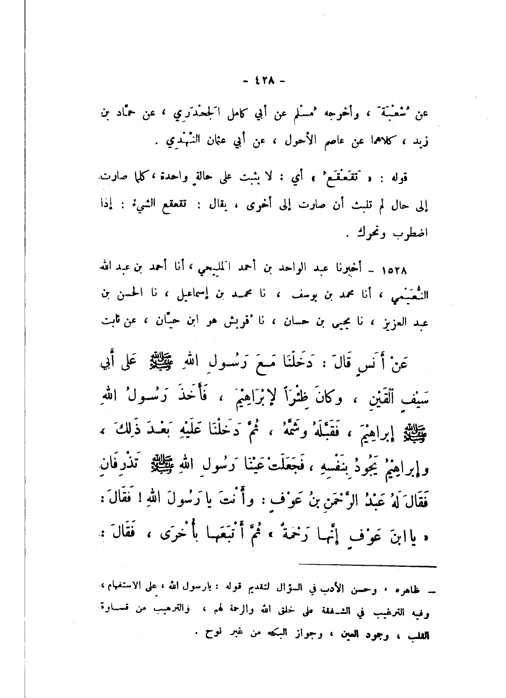 1528 - أَخْبَرَنَا عَبْدُ الْوَاحِدِ بْنُ أَحْمَدَ الْمَلِيحِيُّ، أَنا أَحْمَدُ بْنُ عَبْدِ اللَّهِ النُّعَيْمِيُّ، أَنا مُحَمَّدُ بْنُ يُوسُفَ، نَا مُحَمَّدُ بْنُ إِسْمَاعِيلَ، نَا الْحَسَنُ بْنُ عَبْدِ الْعَزِيزِ، نَا يَحْيَى بْنُ حَسَّانٍ، نَا قُرَيْشٌ هُوَ ابْنُ حَيَّانَ، عَنْ ثَابِتٍ، عَنْ أَنَسٍ، قَالَ: دَخَلْنَا مَعَ رَسُولِ اللَّهِ صَلَّى اللهُ عَلَيْهِ وَسَلَّمَ عَلَى أَبِي سَيْفٍ الْقَيْنِ، وَكَانَ ظِئْرًا لإِبْرَاهِيمَ، فَأَخَذَ رَسُولُ اللَّهِ صَلَّى اللهُ عَلَيْهِ وَسَلَّمَ إِبْرَاهِيمَ، فَقَلَّبَهُ وَشَمَّهُ، ثُمَّ دَخَلْنَا عَلَيْهِ بَعْدَ ذَلِكَ، وَإِبْرَاهِيمُ يَجُودُ بِنَفْسِهِ، فَجَعَلَتْ عَيْنَا رَسُولِ اللَّهِ صَلَّى اللهُ عَلَيْهِ وَسَلَّمَ تَذْرِفَانِ، فَقَالَ لَهُ عَبْدُ الرَّحْمَنِ بْنُ عَوْفٍ: وَأَنْتَ يَا رَسُولَ اللَّهِ! فَقَالَ: «يَابْنَ عَوْفٍ إِنَّهَا رَحْمَةٌ»، ثُمَّ أَتْبَعَهَا بِأُخْرَى، فَقَالَ: «