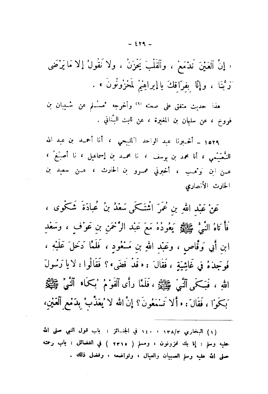 1529 - أَخْبَرَنَا عَبْدُ الْوَاحِدِ الْمَلِيحِيُّ، أَنا أَحْمَدُ بْنُ عَبْدِ اللَّهِ النُّعَيْمِيُّ، أَنا مُحَمَّدُ بْنُ يُوسُفَ، نَا مُحَمَّدُ بْنُ إِسْمَاعِيلَ، نَا أَصْبَغُ، عَنِ ابْنِ وَهْبٍ، أَخْبَرَنِي عَمْرُو بْنُ الْحَارِثِ، عَنْ سَعِيدِ بْنِ الْحَارِثِ الأَنْصَارِيِّ، عَنْ عَبْدِ اللَّهِ بْنِ عُمَرَ، اشْتَكَى سَعْدُ بْنُ عُبَادَةَ شَكْوَى، فَأَتَاهُ النَّبِيُّ صَلَّى اللهُ عَلَيْهِ وَسَلَّمَ يَعُودُهُ مَعَ عَبْدِ الرَّحْمَنِ بْنِ عَوْفٍ وَسَعْدِ بْنِ أَبِي وَقَّاصٍ وَعَبْدِ اللَّهِ بْنِ مَسْعُودٍ، فَلَمَّا دَخَلَ عَلَيْهِ، فَوَجَدَهُ فِي غَاشِيَةٍ، فَقَالَ: «قَدْ قَضَى؟»، فَقَالُوا: لَا يَا رَسُولَ اللَّهِ، فَبَكَى النَّبِيُّ صَلَّى اللهُ عَلَيْهِ وَسَلَّمَ، فَلَمَّا رَأَى الْقَوْمُ بُكَاءَ النَّبِيِّ صَلَّى اللهُ عَلَيْهِ وَسَلَّمَ بَكَوْا، فَقَالَ: «أَلا تَسْمَعُونَ؟ إِنَّ اللَّهَ لَا يُعَذِّبُ بِدَمْعِ الْعَيْنِ،