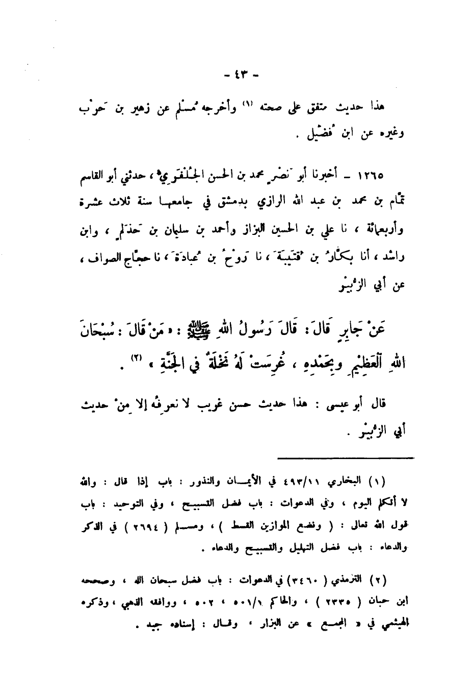 1265 - أَخْبَرَنَا أَبُو نَصْرٍ مُحَمَّدُ بْنُ الْحَسَنِ الْجُلْفَرِيُّ، حَدَّثَنِي أَبُو الْقَاسِمِ تَمَّامُ بْنُ مُحَمَّدِ بْنِ عَبْدِ اللَّهِ الرَّازِيُّ بِدِمَشْقَ فِي جَامِعِهَا سَنَةَ ثَلاثَ عَشْرَةَ وَأَرْبَعِ مِائَةٍ، نَا عَلِيُّ بْنُ الْحُسَيْنِ الْبَزَّازُ، وَأَحْمَدُ بْنُ سُلَيْمَانَ بْنِ حَذْلَمٍ، وَابْنُ رَاشِدٍ، أَنا بَكَّارُ بْنُ قُتَيْبَةَ، نَا رَوْحُ بْنُ عُبَادَةَ، نَا حَجَّاجٌ الصَّوَّافُ، عَنْ أَبِي الزُّبَيْرِ، عَنْ جَابِرٍ، قَالَ: قَالَ رَسُولُ اللَّهِ صَلَّى اللهُ عَلَيْهِ وَسَلَّمَ: " مَنْ قَالَ: سُبْحَانَ اللَّهِ الْعَظِيمِ وَبِحَمْدِهِ، غُرِسَتْ لَهُ نَخْلَةٌ فِي الْجَنَّةِ ".