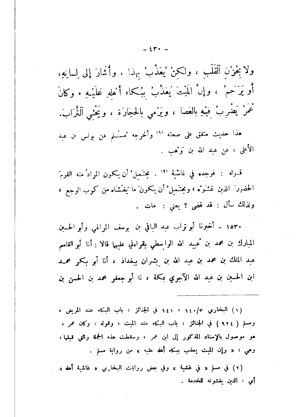 وَلا بِحُزْنِ الْقَلْبِ، وَلَكِنْ يُعَذِّبُ بِهَذَا، وَأَشَارَ إِلَى لِسَانِهِ، أَوْ يَرْحَمُ، وَإِنَّ الْمَيِّتَ يُعَذَّبُ بِبُكَاءِ أَهْلِهِ عَلَيْهِ»، وَكَانَ عُمَرُ يَضْرِبُ فِيهِ بِالْعَصَا، وَيَرْمِي بِالْحِجَارَةِ، وَيَحْثِي التُّرَابَ.