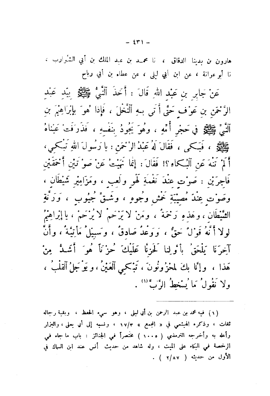 هَارُونَ بْنِ بُدَيْنَا الدَّقَّاقُ، نَا مُحَمَّدُ بْنُ عَبْدِ الْمَلِكِ بْنِ أَبِي الشَّوَارِبِ، نَا أَبُو عَوَانَةَ، عَنِ ابْنِ أَبِي لَيْلَى، عَنْ عَطَاءِ بْنِ أَبِي رَبَاحٍ، عَنْ جَابِرِ بْنِ عَبْدِ اللَّهِ، قَالَ: أَخَذَ النَّبِيُّ صَلَّى اللهُ عَلَيْهِ وَسَلَّمَ بِيَدِ عَبْدِ الرَّحْمَنِ بْنِ عَوْفٍ حَتَّى أَتَى بِهِ النَّخْلَ، فَإِذَا هُوَ بِإِبْرَاهِيمَ بْنِ النَّبِيِّ صَلَّى اللهُ عَلَيْهِ وَسَلَّمَ فِي حِجْرِ أُمِّهِ، وَهُوَ يَجُودُ بِنَفْسِهِ، فَذَرَفَتْ عَيْنَاهُ صَلَّى اللهُ عَلَيْهِ وَسَلَّمَ، فَبَكَى، فَقَالَ لَهُ عَبْدُ الرَّحْمنِ: يَا رَسُولَ اللَّهِ تَبْكِي، أَلَمْ تَنْهَ عَنِ الْبُكَاءِ؟! فَقَالَ: " إِنَّمَا نَهَيْتُ عَنْ صَوْتَيْنِ أَحْمَقَيْنِ فَاجِرَيْنِ: صَوْتٍ عِنْدَ نَغْمَةِ لَهْوٍ وَلَعِبٍ، وَمَزَامِيرِ شَيْطَانٍ، وَصَوْتٍ عِنْدَ مُصِيبَةٍ خَمْشِ وُجُوهٍ، وَشَقِّ جُيُوبٍ، وَرَنَّةِ الشَّيْطَانِ، وَهَذِهِ رَحْمَةٌ، وَمَنْ لَا يَرْحَمْ لَا يُرْحَمْ، يَا إِبْرَاهِيمُ لَوْلا أَنَّهُ قَوْلٌ حَقٌّ، وَوَعْدٌ صَادِقٌ، وَسبِيلٌ مَأْتِيَّةٌ، وَأَنَّ أَخِرَنَا يَلْحَقُ بِأَوَّلِنَا لَحَزِنَّا عَلَيْكَ حُزْنًا هُوَ أَشَدُّ مِنْ هَذَا، وَإِنَّا بِكَ لَمَحْزُونُونَ، تَبْكِي الْعَيْنُ، وَيَوْجَلُ الْقَلْبُ، وَلا نَقُولُ مَا يُسْخِطُ الرَّبَّ ".