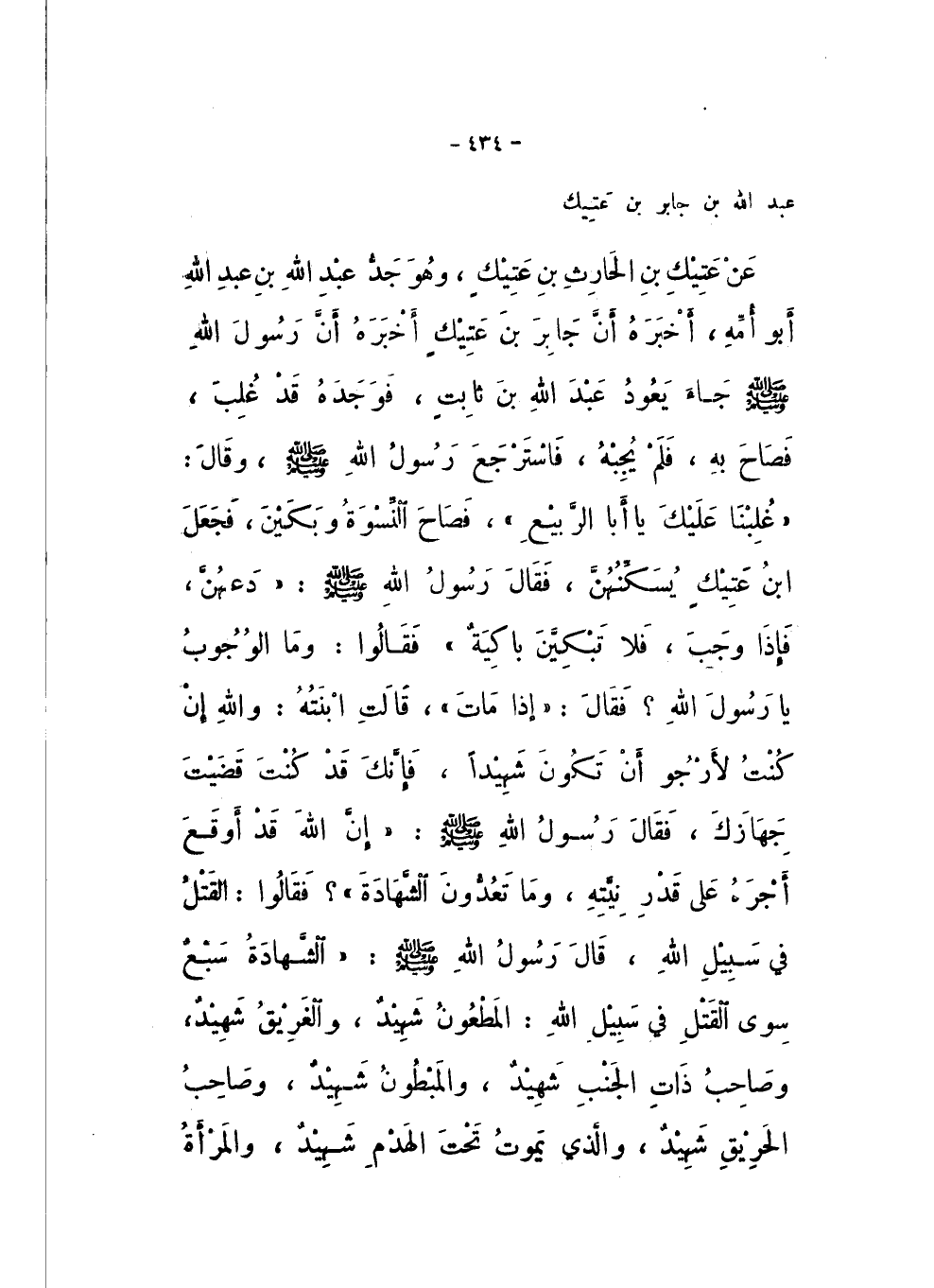 عَبْدِ اللَّهِ بْنِ جَابِرِ بْنِ عَتِيكٍ، عَنْ عَتِيكِ بْنِ الْحَارِثِ بْنِ عَتِيكٍ، وَهُوَ جَدُّ عَبْدِ اللَّهِ بْنِ عَبْدِ اللَّهِ أَبُو أُمِّهِ، أَخْبَرَهُ أَنَّ جَابِرَ بْنَ عَتِيكٍ، أَخْبَرَهُ: أَنّ رَسُولَ اللَّهِ صَلَّى اللهُ عَلَيْهِ وَسَلَّمَ جَاءَ يَعُودُ عَبْدَ اللَّهِ بْنَ ثَابِتٍ، فَوَجَدَهُ قَدْ غُلِبَ، فَصَاحَ بِهِ، فَلَمْ يُجِبْهُ، فَاسْتَرْجَعَ رَسُولُ اللَّهِ صَلَّى اللهُ عَلَيْهِ وَسَلَّمَ، وَقَالَ: «غُلِبْنَا عَلَيْكَ يَا أَبَا الرَّبِيعِ»، فَصَاحَ النِّسْوَةُ وَبَكَيْنَ، فَجَعَلَ ابْنُ عَتِيكٍ يُسَكِّنُهُنَّ، فَقَالَ رَسُولُ اللَّهِ صَلَّى اللهُ عَلَيْهِ وَسَلَّمَ: «دَعْهُنَّ، فَإِذَا وَجَبَ، فَلا تَبْكِينَ بَاكِيَةٌ»، فَقَالُوا: وَمَا الْوُجُوبُ يَا رَسُولَ اللَّهِ؟ فَقَالَ: «إِذَا مَاتَ»، قَالَتِ ابْنَتُهُ: وَاللَّهِ إِنْ كُنْتُ لأَرْجُو أَنْ تَكُونَ شَهِيدًا، فَإِنَّكَ قَدْ كُنْتَ قَضَيْتَ جِهَازَكَ، فَقَالَ رَسُولُ اللَّهِ صَلَّى اللهُ عَلَيْهِ وَسَلَّمَ: «إِنَّ اللَّهَ قَدْ أَوْقَعَ أَجْرَهُ عَلَى قَدْرِ نِيَّتِهِ، وَمَا تَعُدُّونَ الشَّهَادَةَ؟»، فَقَالُوا: الْقَتْلُ فِي سَبِيلِ اللَّهِ، قَالَ رَسُولُ اللَّهِ صَلَّى اللهُ عَلَيْهِ وَسَلَّمَ: «الشَّهَادَةُ سَبْعٌ سِوَى الْقَتْلِ فِي سَبِيلِ اللَّهِ، الْمَطْعُونُ شَهِيدٌ، وَالْغَرِيقُ شَهِيدٌ، وَصَاحِبُ ذَاتِ الْجَنْبِ شَهِيدٌ، وَالْمَبْطُونُ شَهِيدٌ، وَصَاحِبُ الْحَرِيقِ شَهِيدٌ، وَالَّذِي يَمُوتُ تَحْتَ الْهَدْمِ شَهِيدٌ، وَالْمَرْأَةُ
