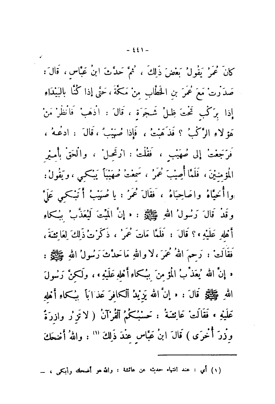 كانَ عُمَرُ يَقُولُ بَعْضَ ذَلِكَ، ثُمَّ حَدَّثَ ابْنُ عَبَّاسٍ، قَالَ: صَدَرْتُ مَعَ عُمَرَ بْنِ الْخَطَّابِ مِنْ مَكَّةَ، حَتَّى إِذَا كُنَّا بِالْبَيْدَاءِ إِذَا بِرَكْبٍ تَحْتَ ظِلِّ شَجَرَةٍ، قَالَ: اذْهَبْ فَانْظُرْ مَنْ هَؤُلاءِ الرَّكْبُ؟ فَذَهَبْتُ، فَإِذَا صُهَيْبٌ، قَالَ: ادْعُهُ، فَرَجَعْتُ إِلَى صُهَيْبٍ، فَقُلْتُ: ارْتَحِلْ، وَالْحَقْ بِأَمِيرِ الْمُؤْمِنِينَ، فَلَمَّا أُصِيبَ عُمَرُ، سَمِعْتُ صُهَيْبًا يَبْكِي، وَيَقُولُ: وَاأُخَيَّاهُ وَاصَاحِبَاهُ، فَقَالَ عُمَرُ: يَا صُهَيْبُ أَتَبْكِي عَلَيَّ، وَقَدْ قَالَ رَسُولُ اللَّهِ صَلَّى اللهُ عَلَيْهِ وَسَلَّمَ: «إِنَّ الْمَيِّتَ لَيُعَذَّبُ بِبُكَاءِ أَهْلِهِ عَلَيْهِ؟»، قَالَ: فَلَمَّا مَاتَ عُمَرُ، ذَكَرْتُ ذَلِكَ لِعَائِشَةَ، فَقَالَتْ: رَحِمَ اللَّهُ عُمَرَ، لَا وَاللَّهِ مَا حَدَّثَ رَسُولُ اللَّهِ صَلَّى اللهُ عَلَيْهِ وَسَلَّمَ: «إِنَّ اللَّهَ يُعَذِّبُ الْمُؤْمِنَ بِبُكَاءِ أَهْلِهِ عَلَيْهِ»، وَلَكِنَّ رَسُولَ اللَّهِ صَلَّى اللهُ عَلَيْهِ وَسَلَّمَ، قَالَ: «إِنَّ اللَّهَ يَزِيدُ الْكَافِرَ عَذَابًا بِبُكَاءِ أَهْلِهِ عَلَيْهِ»، فَقَالَتْ عَائِشَةُ: حَسْبُكُمُ القُرْآنُ {وَلا تَزِرُ وَازِرَةٌ وِزْرَ أُخْرَى} [الْأَنْعَام: 164]، قَالَ ابْنُ عَبَّاسٍ عِنْدَ ذَلِكَ: وَاللَّهُ أَضْحَكَ