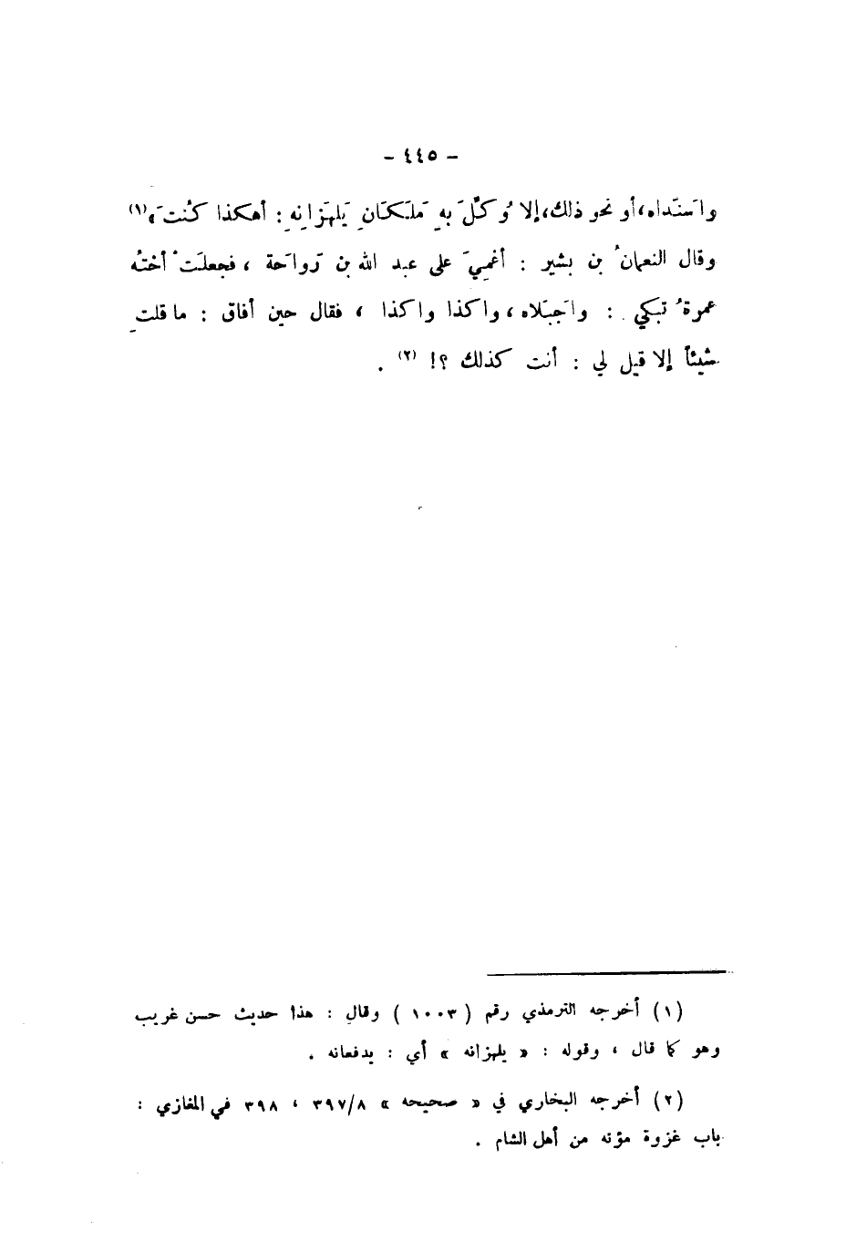 وَاسَنَدَاهُ، أَوْ نَحْوَ ذَلِكَ، إِلا وُكِّلَ بِهِ مَلَكَانِ يَلْهَزَانِهِ، أَهَكَذَا كُنْتَ "، وَقَالَ النُّعْمَانُ بْنُ بَشِيرٍ: أُغْمِيَ عَلَى عَبْدِ اللَّهِ بْنِ رَوَاحَةَ، فَجَعَلَتْ أُخْتُهُ عَمْرَةُ تَبْكِي: وَاجَبَلاهُ، وَاكَذَا وَاكَذَا، فَقَالَ حِينَ أَفَاقَ: مَا قُلْتِ شَيْئًا إِلا قِيلَ لِي: أَأَنْتَ كَذَلِكَ؟!.