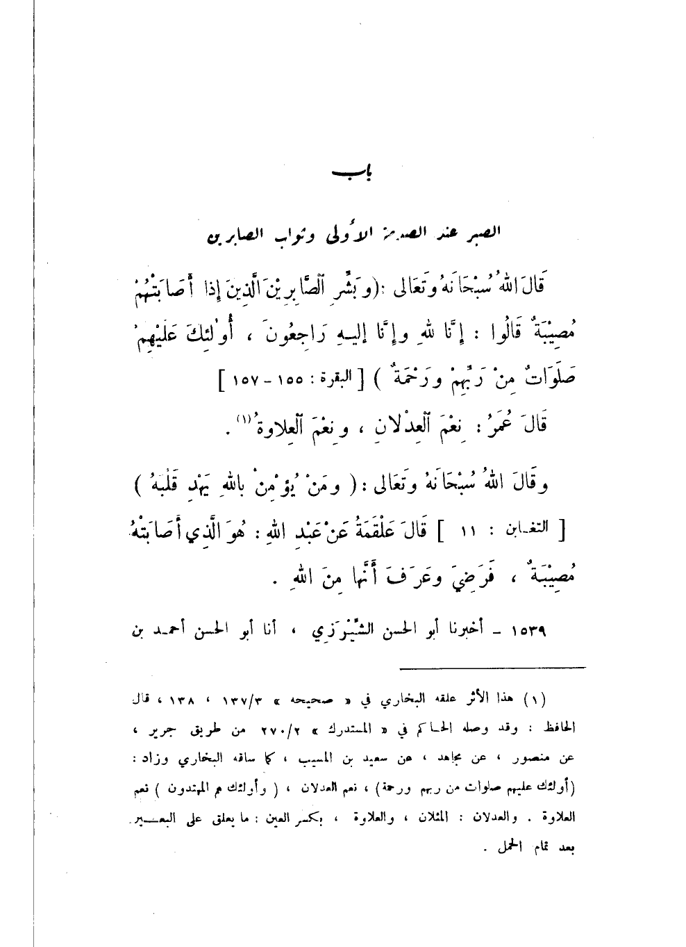 قَالَ اللَّهُ سُبْحَانَهُ وَتَعَالَى: {وَبَشِّرِ الصَّابِرِينَ {155} الَّذِينَ إِذَا أَصَابَتْهُمْ مُصِيبَةٌ قَالُوا إِنَّا لِلَّهِ وَإِنَّا إِلَيْهِ رَاجِعُونَ {156} أُولَئِكَ عَلَيْهِمْ صَلَوَاتٌ مِنْ رَبِّهِمْ وَرَحْمَةٌ} [الْبَقَرَة: 155 - 157].