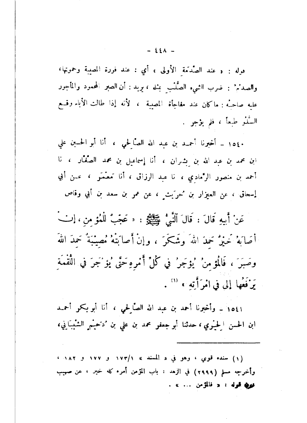 1540 - أَخْبَرَنَا أَحْمَدُ بْنُ عَبْدِ اللَّهِ الصَّالِحِيُّ، أَنا أَبُو الْحُسَيْنِ عَلِيُّ بْنُ مُحَمَّدِ بْنِ عَبْدِ اللَّهِ بْنِ بِشْرَانَ، أَنا إِسْمَاعِيلُ بْنُ مُحَمَّدٍ الصَّفَّارُ، نَا أَحْمَدُ بْنُ مَنْصُورٍ الرَّمَادِيُّ، نَا عَبْدُ الرَّزَّاقِ، أَنا مَعْمَرٌ، عَنْ أَبِي إِسْحَاقَ، عَنِ الْعَيْزَارِ بْنِ حُرَيْثٍ، عَنْ عُمَرَ بْنِ سَعْدِ بْنِ أَبِي وَقَّاصٍ، عَنْ أَبِيهِ، قَالَ: قَالَ النَّبِيُّ صَلَّى اللهُ عَلَيْهِ وَسَلَّمَ: «عَجَبٌ لِلْمُؤْمِنِ، إِنْ أصَابَهُ خَيْرٌ حَمِدَ اللَّهَ وَشَكَرَ، وَإِنْ أَصَابَتْهُ مُصِيبَةٌ حَمِدَ اللَّهَ وَصَبَرَ، فَالْمُؤْمِنُ يُؤْجَرُ فِي كُلِّ أَمْرِهِ حَتَّى يُؤْجَرَ فِي اللُّقْمَةِ يَرْفَعُهَا إِلَى فِي امْرَأَتِهِ».