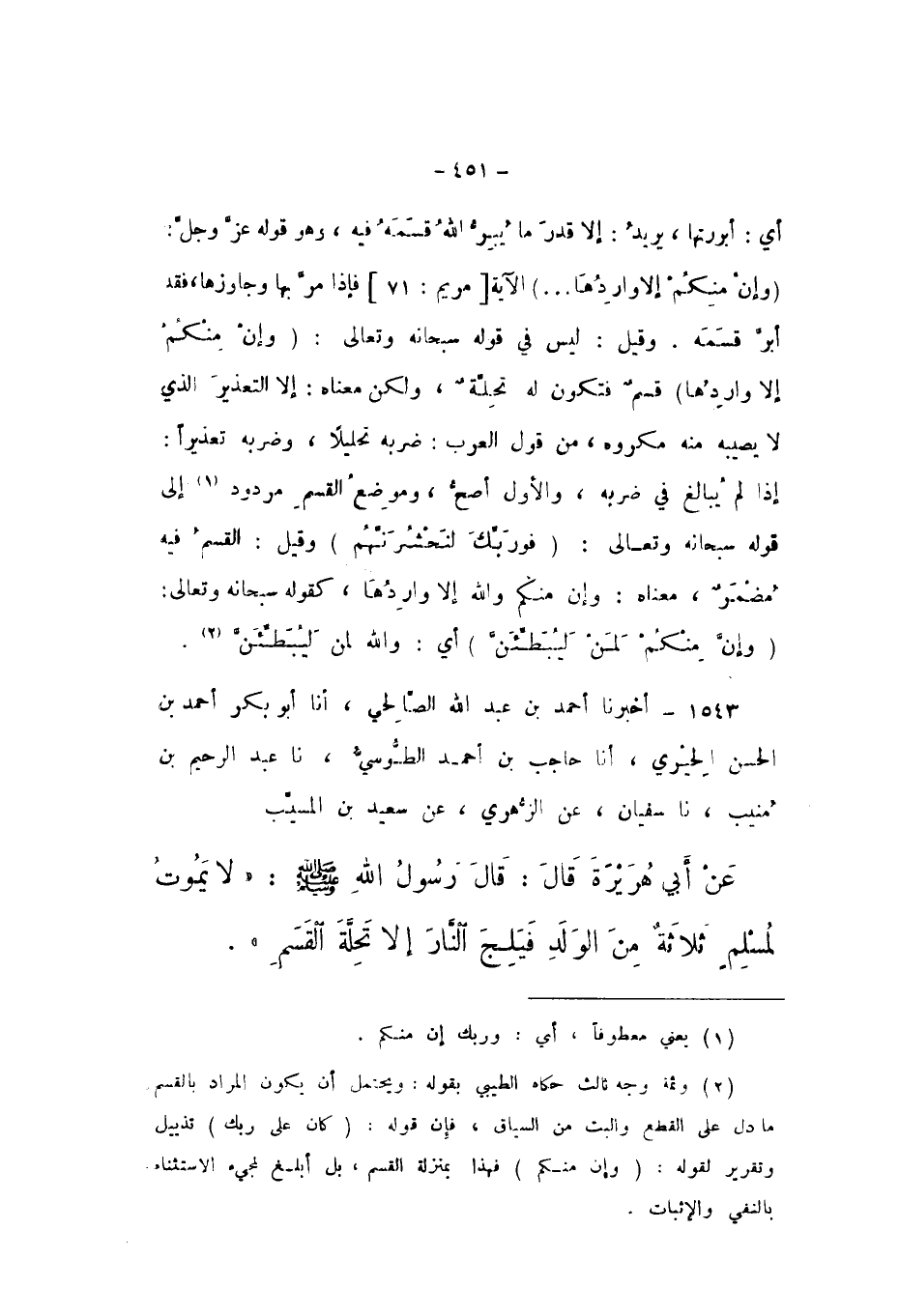 1543 - أَخْبَرَنَا أَحْمَدُ بْنُ عَبْدِ اللَّهِ الصَّالِحِيُّ، أَنا أَبُو بَكْرٍ أَحْمَدُ بْنُ الْحَسَنِ الْحِيرِيُّ، أَنا حَاجِبُ بْنُ أَحْمَدَ الطُّوسِيُّ، نَا عَبْدُ الرَّحِيمِ بْنُ مُنِيبٍ، نَا سُفْيَانُ، عَنِ الزُّهْرِيِّ، عَنْ سَعِيدِ بْنِ الْمُسَيِّبِ، عَنْ أَبِي هُرَيْرَةَ، قَالَ: قَالَ رَسُولُ اللَّهِ صَلَّى اللهُ عَلَيْهِ وَسَلَّمَ: «لَا يَمُوتُ لِمُسْلِمٍ ثَلاثَةٌ مِنَ الْوَلَدِ فَيَلِجَ النَّارَ إِلا تَحِلَّةَ الْقَسَمِ».