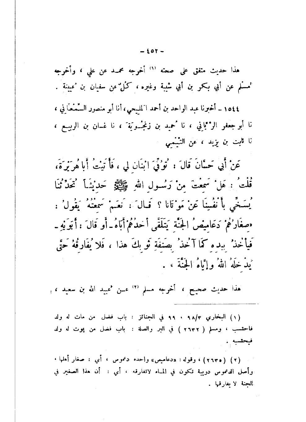 1544 - أَخْبَرَنَا عَبْدُ الْوَاحِدِ بْنُ أَحْمَدَ الْمَلِيحِيُّ، أَنا أَبُو مَنْصُورٍ السَّمْعَانِيُّ، نَا أَبُو جَعْفَرٍ الرَّيَّانِيُّ، نَا حُمَيْدُ بْنُ زَنْجُوَيْهِ، نَا غَسَّانُ بْنُ الرَّبِيعِ، نَا ثَابِتُ بْنُ يَزِيدَ، عَنِ التَّيْمِيِّ، عَنْ أَبِي حَسَّانٍ، قَالَ: تُوُفِّيَ ابْنَانِ لِي، فَأَتَيْتُ أَبَا هُرَيْرَةَ، قُلْتُ: هَلْ سَمِعْتَ مِنْ رَسُولِ اللَّهِ صَلَّى اللهُ عَلَيْهِ وَسَلَّمَ حَدِيثًا تُحَدِّثُنَا يُسَخِّي بِأَنْفُسِنَا عَنْ مَوْتَانَا؟، قَالَ: نَعَمْ سَمِعْتُهُ، يَقُولُ: " صِغَارُهُمْ دَعَامِيصُ الْجَنَّةِ يَتَلقَّى أَحَدُهُمْ أَبَاهُ، أَوْ قَالَ: أَبَوَيْهِ، فَيَأْخُذُ بِيَدِهِ كَمَا آخُذُ بِصَنِفَةِ ثَوْبِكَ هَذَا، فَلا يُفَارِقُهُ حَتَّى يُدْخِلَهُ اللَّهُ وَإِيَّاهُ الْجَنَّةَ ".