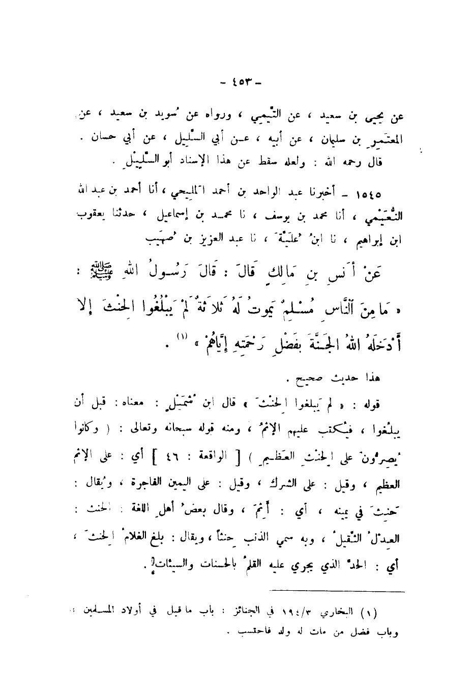 1545 - أَخْبَرَنَا عَبْدُ الْوَاحِدِ بْنُ أَحْمَدَ الْمَلِيحِيُّ، أَنا أَحْمَدُ بْنُ عَبْدِ اللَّهِ النُّعَيْمِيُّ، أَنا مُحَمَّدُ بْنُ يُوسُفَ، نَا مُحَمَّدُ بْنُ إِسْمَاعِيلَ، حَدَّثَنَا يَعْقُوبُ بْنُ إِبْرَاهِيمَ، نَا ابْنُ عُلَيَّةَ، نَا عَبْدُ الْعَزِيزِ بْنُ صُهَيْبٍ، عَنْ أَنَسِ بْنِ مَالِكٍ، قَالَ: قَالَ رَسُولُ اللَّهِ صَلَّى اللهُ عَلَيْهِ وَسَلَّمَ: «مَا مِنَ النَّاسِ مُسْلِمٌ يَمُوتُ لَهُ ثَلاثَةٌ لَمْ يَبْلُغُوا الْحِنْثَ إِلا أَدْخَلَهُ اللَّهُ الْجَنَّةَ بِفَضْلِ رَحْمَتِهِ إِيَّاهُمْ».