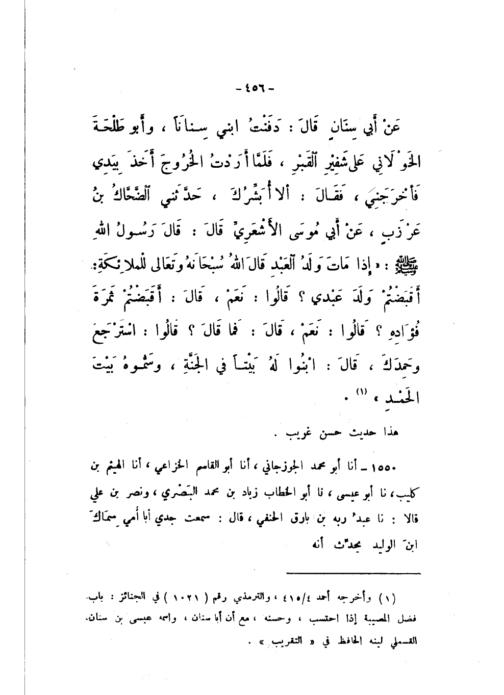 عَنْ أَبِي سِنَانٍ، قَالَ: دَفَنْتُ ابْنِي سِنَانًا، وَأَبُو طَلْحَةَ الْخَوْلانِيُّ عَلَى شَفِيرِ الْقَبْرِ، فَلَمَّا أَرَدْتُ الْخُرُوجَ أَخَذَ بِيَدِي فَأخْرَجَنِي، فَقَالَ: أَلا أُبَشِّرُكَ، حَدَّثَني الضَّحَّاكُ بْنُ عَرْزَبٍ، عَنْ أَبِي مُوسَى الأَشْعَرِيِّ، قَالَ: قَالَ رَسُولُ اللَّهِ صَلَّى اللهُ عَلَيْهِ وَسَلَّمَ: " إِذَا مَاتَ وَلَدُ الْعَبْدِ، قَالَ اللَّهُ سُبْحَانَهُ وَتَعَالَى لِلْمَلائِكَةِ: أَقَبَضْتُمْ وَلَدَ عَبْدِي؟ قَالُوا: نَعَمْ، قَالَ: أَقَبَضْتُمْ ثَمَرَةَ فُؤادِهِ؟ قَالُوا: نَعَمْ، قَالَ: فَما قَالَ؟ قَالُوا: اسْتَرْجَعَ وَحَمِدَكَ، قَالَ: ابْنُوا لَهُ بَيْتًا فِي الْجَنَّةِ، وَسَمُّوهُ بَيْتَ الْحَمْدِ ".
