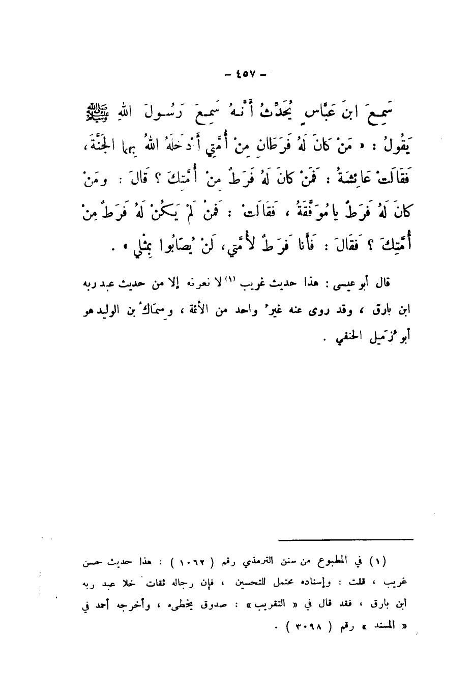 سَمِعَ ابْنَ عَبَّاسٍ، يُحَدِّثُ أَنَّهُ سَمِعَ رَسُولَ اللَّهِ صَلَّى اللهُ عَلَيْهِ وَسَلَّمَ، يَقُولُ: «مَنْ كَانَ لَهُ فَرَطَانِ مِنْ أُمَّتِي أَدْخَلَهُ اللَّهُ بِهِمَا الْجَنَّةَ»، فَقَالَتْ عَائِشَةُ: فَمَنْ كَانَ لَهُ فَرَطٌ مِنْ أُمَّتِكَ؟ قَالَ: «وَمَنْ كَانَ لَهُ فَرَطٌ يَا مُوَفَّقَةُ»، فَقَالَتْ: فَمنْ لَمْ يَكُنْ لَهُ فَرَطٌ مِنْ أُمَّتِكَ؟، فَقَالَ: «فَأَنَا فَرَطٌ لأُمَّتِي، لَنْ يُصَابُوا بِمثْلِي».