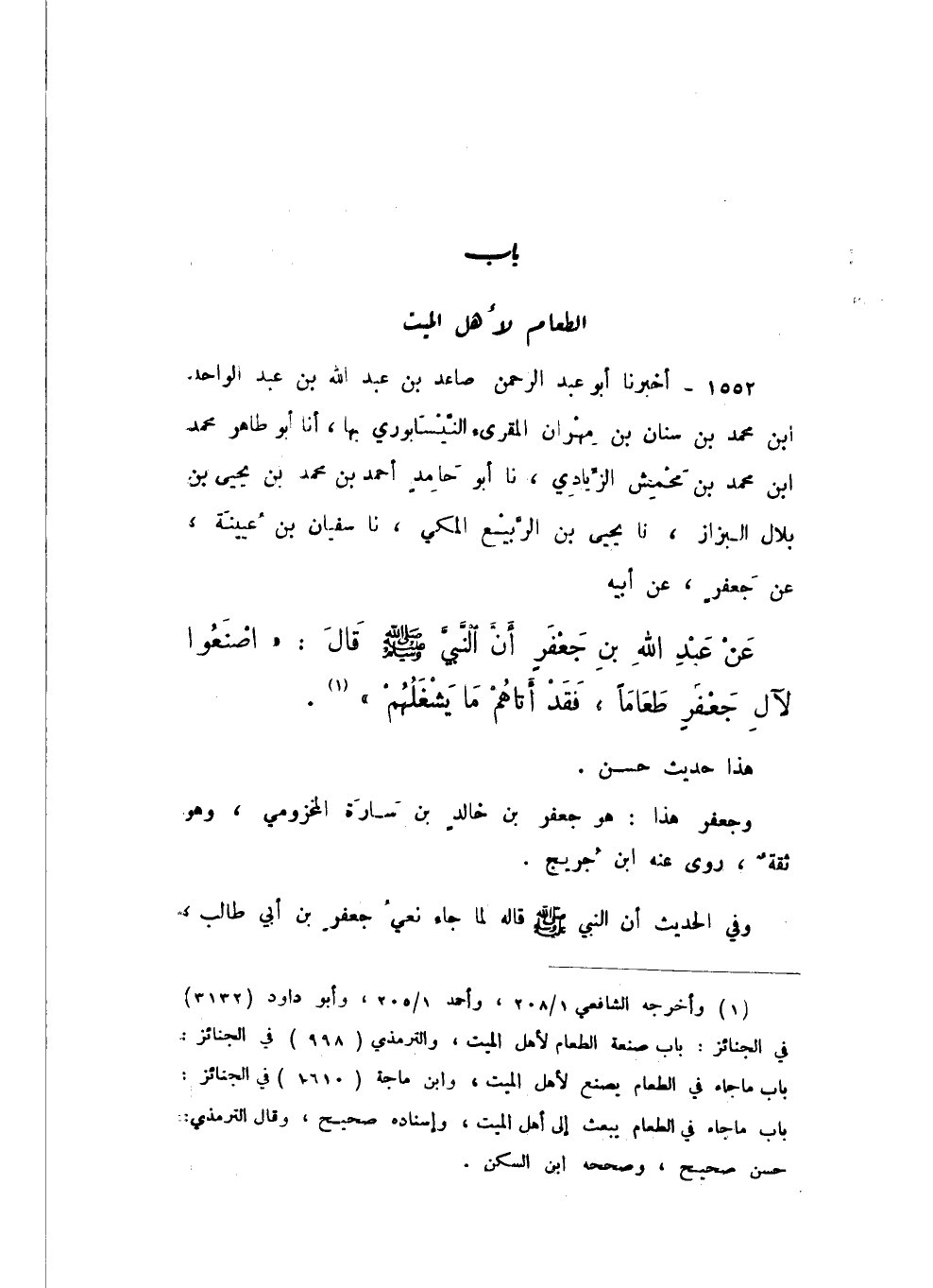 1552 - أَخْبَرَنَا أَبُو عَبْدِ الرَّحْمَنِ صَاعِدُ بْنُ عَبْدِ اللَّهِ بْنِ عَبْدِ الْوَاحِدِ بْنِ مُحَمَّدِ بْنِ سِنَانِ بْنِ مِهْرَانَ الْمُقْرِئُ النَّيْسَابُورِيُّ، بِهَا، أَنا أَبُو طَاهِرٍ مُحَمَّدُ بْنُ مَحْمِشٍ الزِّيَادِيُّ، نَا أَبُو حَامِدٍ أَحْمَدُ بْنُ مُحَمَّدِ بْنِ يَحْيَى بْنِ بِلالٍ الْبَزَّازُ، نَا يَحْيَى بْنُ الرَّبِيعِ الْمَكِّيُّ، نَا سُفْيَانُ بْنُ عُيَيْنَةَ، عَنْ جَعْفَرٍ، عَنْ أَبِيهِ، عَنْ عَبْدِ اللَّهِ بْنِ جَعْفَرٍ، أَنّ النَّبِيَّ صَلَّى اللهُ عَلَيْهِ وَسَلَّمَ، قَالَ: «اصْنَعُوا لآلِ جَعْفَرٍ طَعَامًا، فَقَدْ أَتَاهُمْ مَا يَشْغَلُهُمْ».