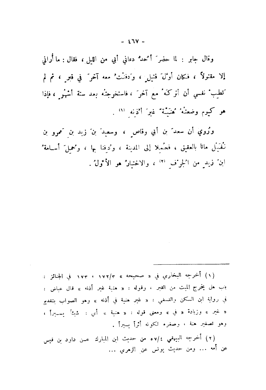 وَقَالَ جَابِرٌ: لَمَّا حُضِرَ أُحُدٌ دَعَانِي أَبِي مِنَ اللَّيْلِ، فَقَالَ: مَا أُرَانِي إِلا مَقْتُولا، فَكَانَ أَوَّلَ قَتِيلٍ، وَدَفَنْتُ مَعَهُ آخَرَ فِي قَبْرٍ، ثُمَّ لَمْ تَطِبْ نَفْسِي أَنْ أَتْرُكَهُ مَعَ آخَرَ، فَاسْتَخْرَجْتُهُ بَعْدَ سِتَّةِ أَشْهُرٍ، فَإِذَا هُوَ كَيَوْمِ وَضَعْتُهُ هُنَيَّةً غَيْرَ أُذُنِهِ.