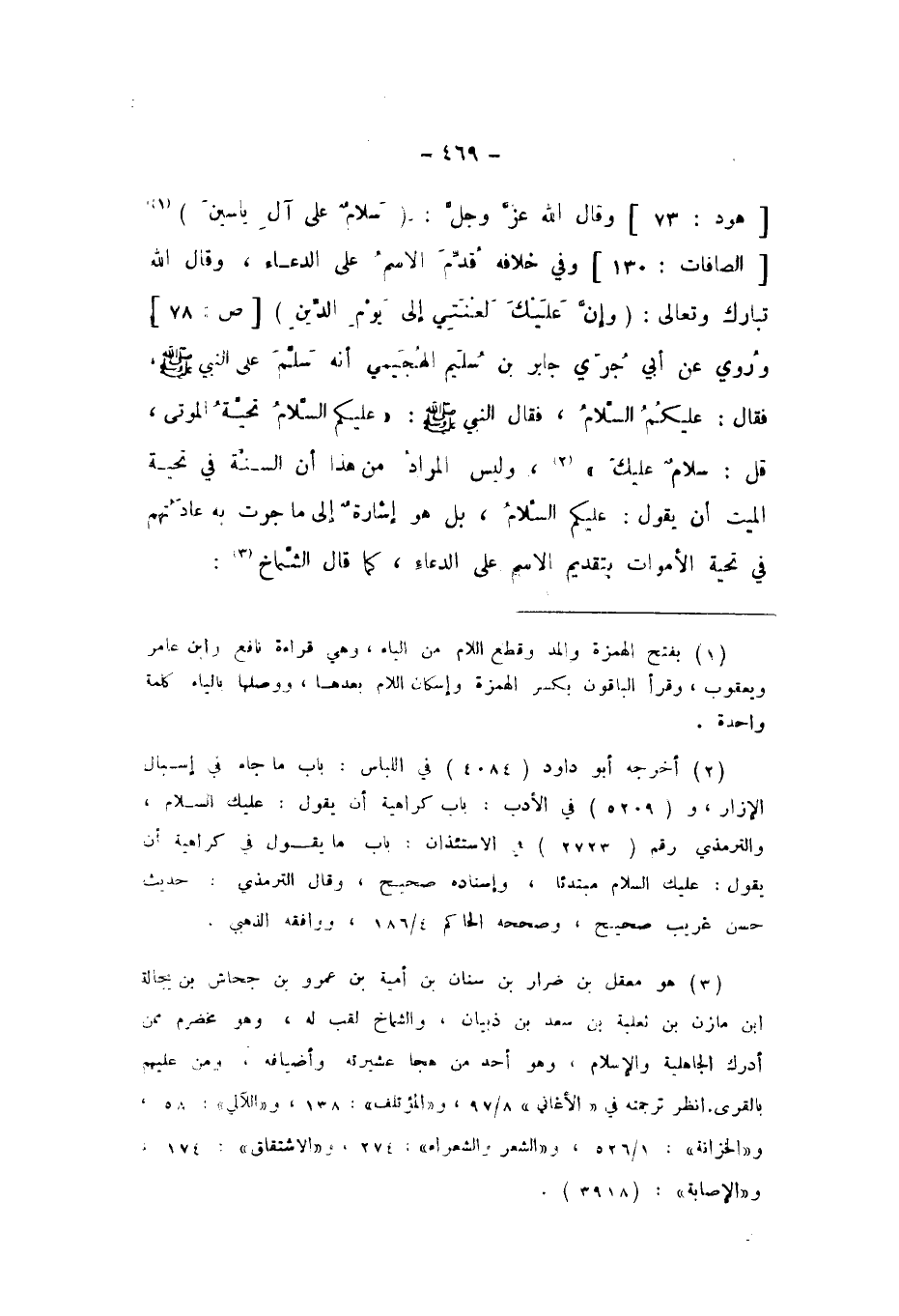 هود: 73]، وَقَالَ اللَّهُ عَزَّ وَجَلَّ: سَلامٌ عَلَى آل يَاسِينَ الصافات 130، وَفِي خِلافِهِ قُدِّمَ الاسْمُ عَلَى الدُّعَاءِ، وَقَالَ اللَّهُ تَبَارَكَ وَتَعَالَى: {وَإِنَّ عَلَيْكَ لَعْنَتِي إِلَى يَوْمِ الدِّينِ} [ص: 78] وَرُوِيَ عَنْ أَبِي جُرَيٍّ جَابِرِ بْنِ سُلَيْمٍ الْهُجَيْمِيِّ، أَنَّهُ سَلَّمَ عَلَى النَّبِيِّ صَلَّى اللهُ عَلَيْهِ وَسَلَّمَ، فَقَالَ: عَلَيْكُمُ السَّلامُ، فَقَالَ النَّبِيُّ صَلَّى اللهُ عَلَيْهِ وَسَلَّمَ: " عَلَيْكُمُ السَّلامُ تَحِيَّةُ الْمَوْتَى، قُلْ: سَلامٌ عَلَيْكَ "، وَلَيْسَ الْمُرَادُ مِنْ هَذَا أَنَّ السُّنَّةَ فِي تَحِيَّةِ الْمَيِّتِ، أَنْ يَقُولَ: عَلَيْكُمُ السَّلامُ، بَلْ هُوَ إِشَارَةٌ إِلَى مَا جَرَتْ بِهِ عَادَتُهُمْ فِي تَحِيَّةِ الأَمْوَاتِ، بِتَقْدِيمِ الاسْمِ عَلَى الدُّعَاءِ، كَمَا قَالَ الشَّمَّاخُ: