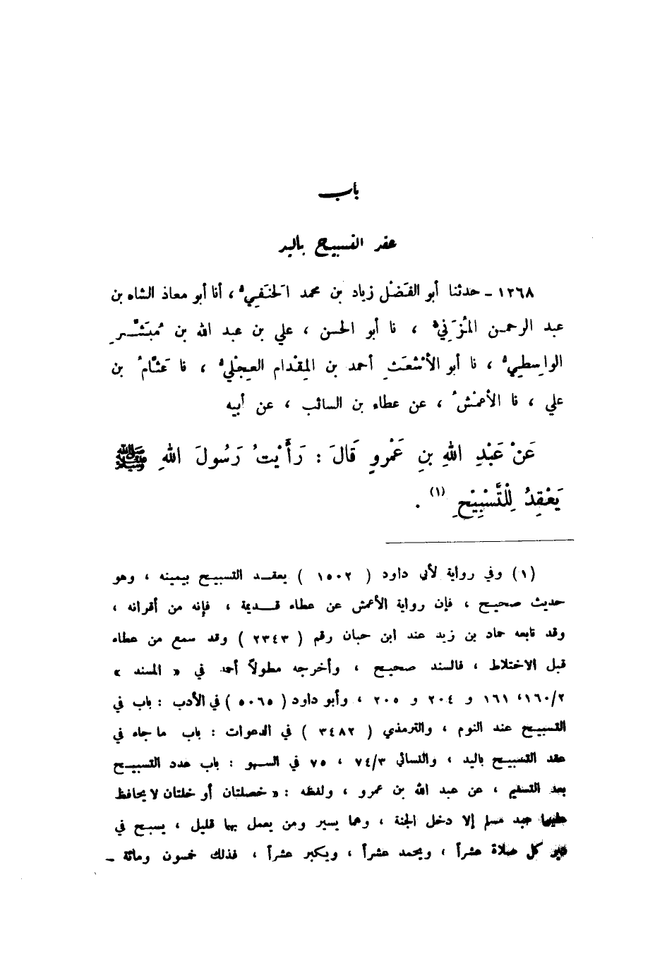 ، أَنا أَبُو مُعَاذٍ الشَّاهُ بْنُ عَبْدِ الرَّحْمَنِ الْمُزَنِيُّ، نَا أَبُو الْحَسَنِ عَلِيُّ بْنُ عَبْدِ اللَّهِ بْنِ مُبَشَّرِ الْوَاسِطِيُّ، نَا أَبُو الأَشْعَثِ أَحْمَدُ بْنُ الْمِقْدَامِ الْعِجْلِيُّ، نَا عَثَّامُ بْنُ عَلِيٍّ، نَا الأَعْمَشُ، عَنْ عَطَاءِ بْنِ السَّائِبِ، عَنْ أَبِيهِ، عَنْ عَبْدِ اللَّهِ بْنِ عَمْرٍو، قَالَ: رَأَيْتُ رَسُولَ اللَّهِ صَلَّى اللهُ عَلَيْهِ وَسَلَّمَ «يَعْقِدُ لِلتَّسْبِيحِ».