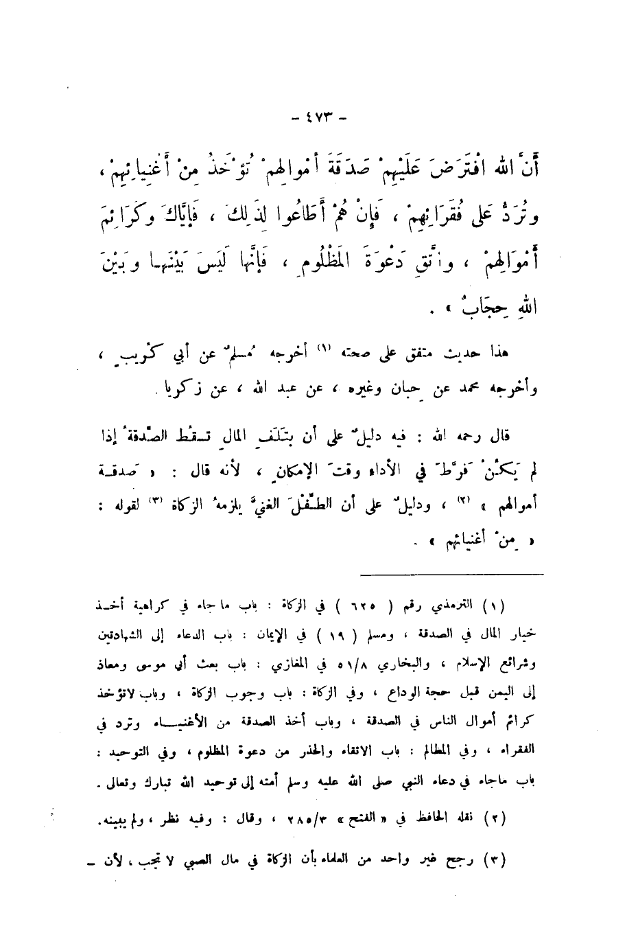 قَالَ رَحِمَهُ اللَّهُ: فِيهِ دَلِيلٌ عَلَى أَنَّ بِتَلَفِ الْمَالِ تَسْقُطُ الصَّدَقَةُ، إِذَا لَمْ يَكُنْ فَرَّطَ فِي الأَدَاءِ وَقْتَ الإِمْكَانِ، لأَنَّهُ قَالَ: «صَدَقَةُ أَمْوَالِهِمْ»، وَدَلِيلٌ عَلَى أَنَّ الطِّفْلَ الْغَنِيَّ يَلْزَمُهُ الزَّكَاةُ لِقَوْلِهِ: «مِنْ أَغْنِيَائِهِمْ».