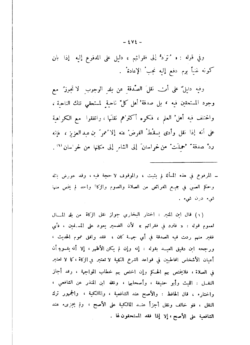 وَفِي قَوْلُهُ: «تُرَدُّ إِلَى فُقَرَائِهِمْ» دَلِيلٌ عَلَى الْمَدْفُوعِ إِلَيْهِ إِذَا بَانَ كَوْنُهُ غَنِيًّا يَوْمَ دُفِعَ إِلَيْهِ تَجِبُّ الإِعَادَةُ.