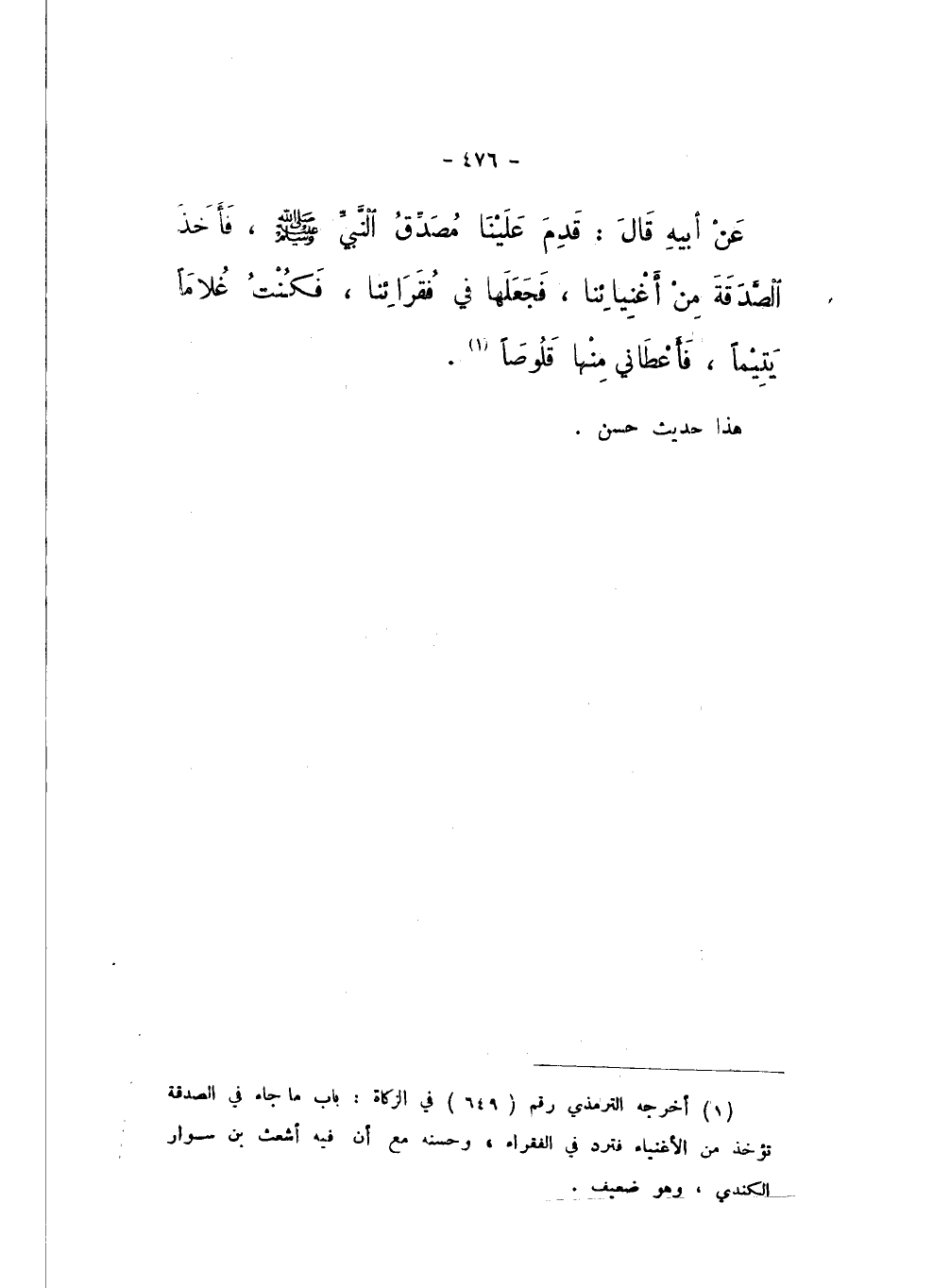 عَنْ أَبِيهِ، قَالَ: «قَدِمَ عَلَيْنَا مُصَدِّقُ النَّبِيِّ صَلَّى اللهُ عَلَيْهِ وَسَلَّمَ فَأَخَذَ الصَّدَقَةَ مِنْ أَغْنِيَائِنَا، فَجَعَلَهَا فِي فُقَرَائِنَا، فَكُنْتُ غُلامًا يَتِيمًا، فَأَعْطَانِي مِنْهَا قَلُوصًا».