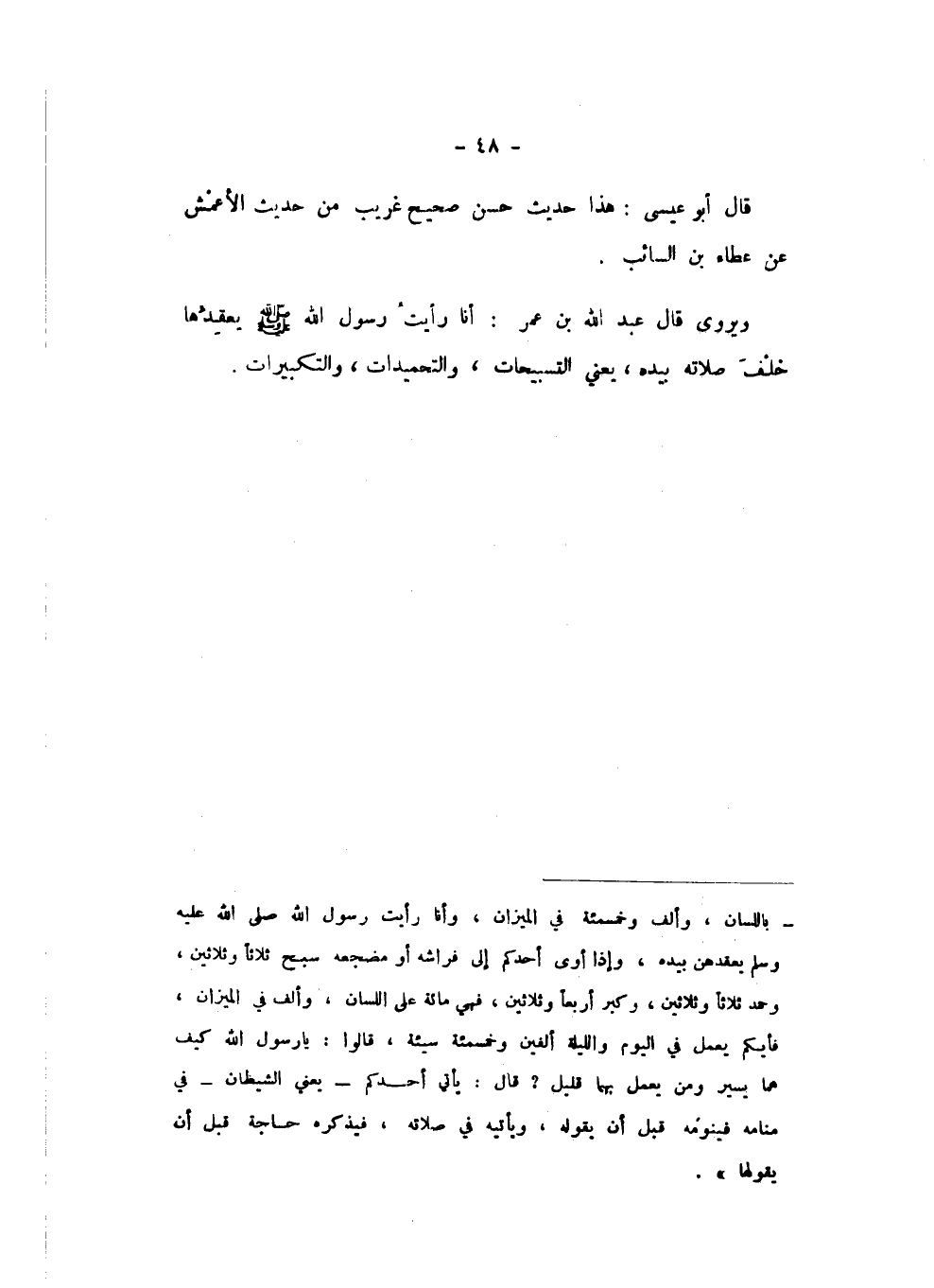 وَيُرْوَى قَالَ عَبْدُ اللَّهِ بْنُ عُمَرَ: أَنَا رَأَيْتُ رَسُولَ اللَّهِ صَلَّى اللهُ عَلَيْهِ وَسَلَّمَ يَعْقِدُهَا خَلْفَ صَلاتِهِ بِيَدِهِ، يَعْنِي التَّسْبِيحَاتِ، وَالتَّحْمِيدَاتِ، وَالتَّكْبِيرَاتِ