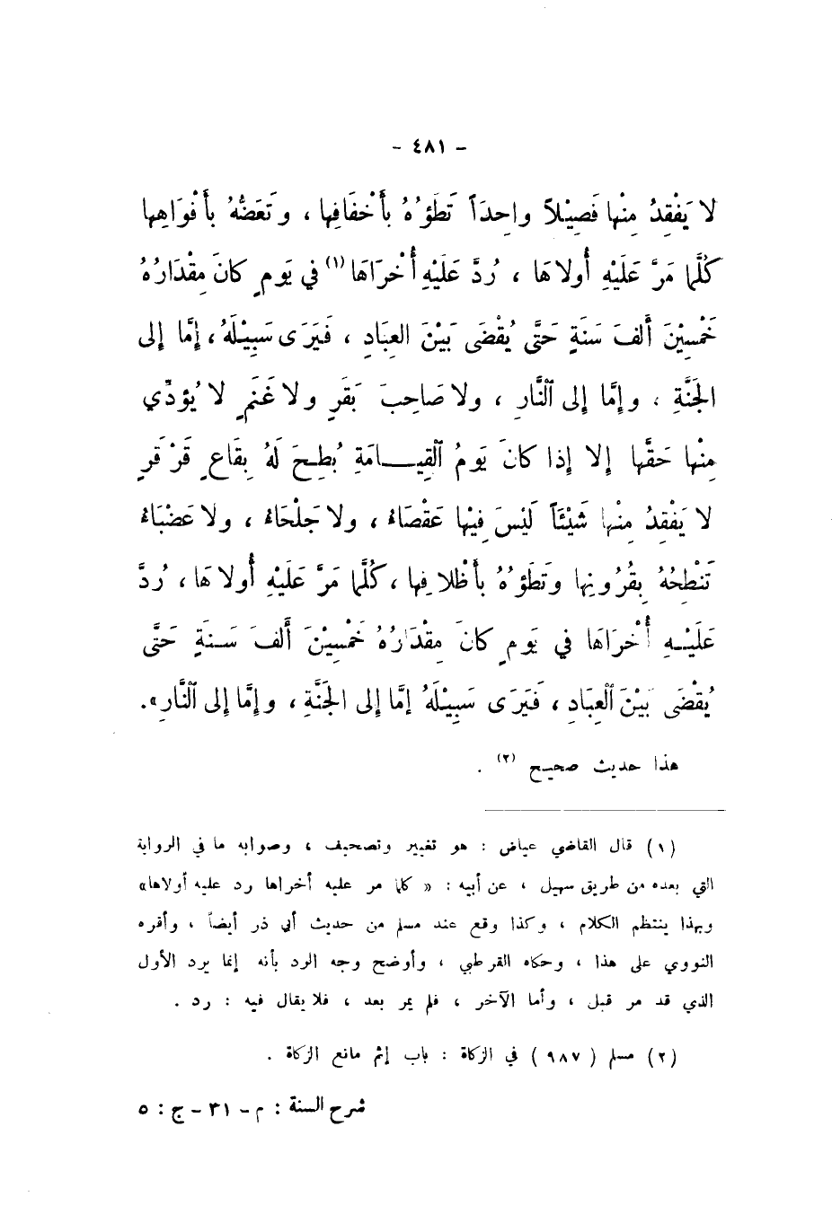 لَا يَفْقِدُ مِنْهَا فَصِيلا وَاحِدًا تَطَؤُهُ بِأَخْفَافِهَا، وَتَعَضُّهُ بِأَفْوَاهِهَا كُلَّمَا مَرَّ عَلَيْهِ أُولاهَا، رُدَّ عَلَيْهِ أُخْرَاهَا فِي يَوْمٍ كَانَ مِقْدَارُهُ خَمْسِينَ أَلْفَ سَنَةٍ حَتَّى يُقْضَى بَيْنَ الْعِبَادِ، فَيَرَى سَبِيلَهُ، إِمَّا إِلَى الْجَنَّةِ، وَإِمَّا إِلَى النَّارِ، وَلا صَاحِبَ بَقَرٍ وَلا غَنَمٍ لَا يُؤَدِّي مِنْهَا حَقَّهَا إِلا إِذَا كَانَ يَوْمُ الْقِيَامَةِ بُطِحَ لَهُ بِقَاعٍ قَرْقَرٍ لَا يَفْقِدُ مِنْهَا شَيْئًا لَيْسَ فِيهَا عَقْصَاءُ، وَلا جَلْحَاءُ، وَلا عَضْبَاءُ تَنْطِحُهُ بِقُرُونِهَا وَتَطَؤُهُ بِأَظْلافِهَا، كُلَّما مَرَّ عَلَيْهِ أُولاهَا رُدَّ عَلَيْهِ أُخْرَاهَا فِي يَوْمٍ كَانَ مِقْدَارُهُ خَمْسِينَ أَلْفَ سَنَةٍ حَتَّى يُقْضَى بَيْنَ الْعِبَادِ، فَيَرَى سَبِيلَهُ إِمَّا إِلَى الْجَنَّةِ، وَإِمَّا إِلَى النَّارِ».