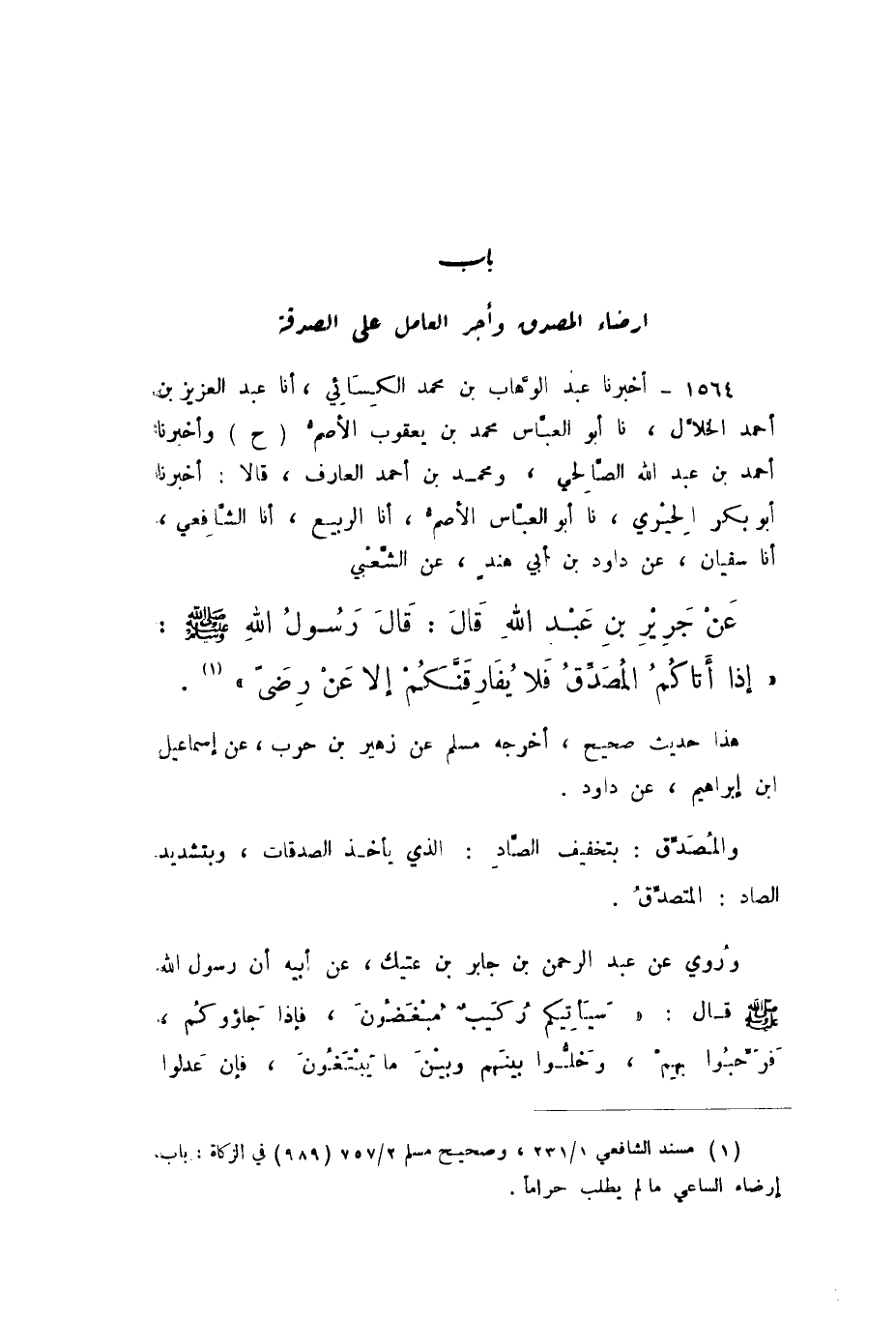 ح وَأَخْبَرَنَا أَحْمَدُ بْنُ عَبْدِ اللَّهِ الصَّالِحِيُّ، وَمُحَمَّدُ بْنُ أَحْمَدَ الْعَارِفُ، قَالا: أَخْبَرَنَا أَبُو بَكْرٍ الْحِيرِيُّ، نَا أَبُو الْعَبَّاسِ الأَصَمُّ، أَنا الرَّبِيعُ، أَنا الشَّافِعِيُّ، أَنا سُفْيَانُ، عَنْ دَاوُدَ بْنِ أَبِي هِنْدٍ، عَنِ الشَّعْبِيِّ، عَنْ جَرِيرِ بْنِ عَبْدِ اللَّهِ، قَالَ: قَالَ رَسُولُ اللَّهِ صَلَّى اللهُ عَلَيْهِ وَسَلَّمَ: «إِذَا أَتَاكُمُ المُصَدِّقُ، فَلا يُفَارِقَنَّكُمْ إِلا عَنْ رِضًا».