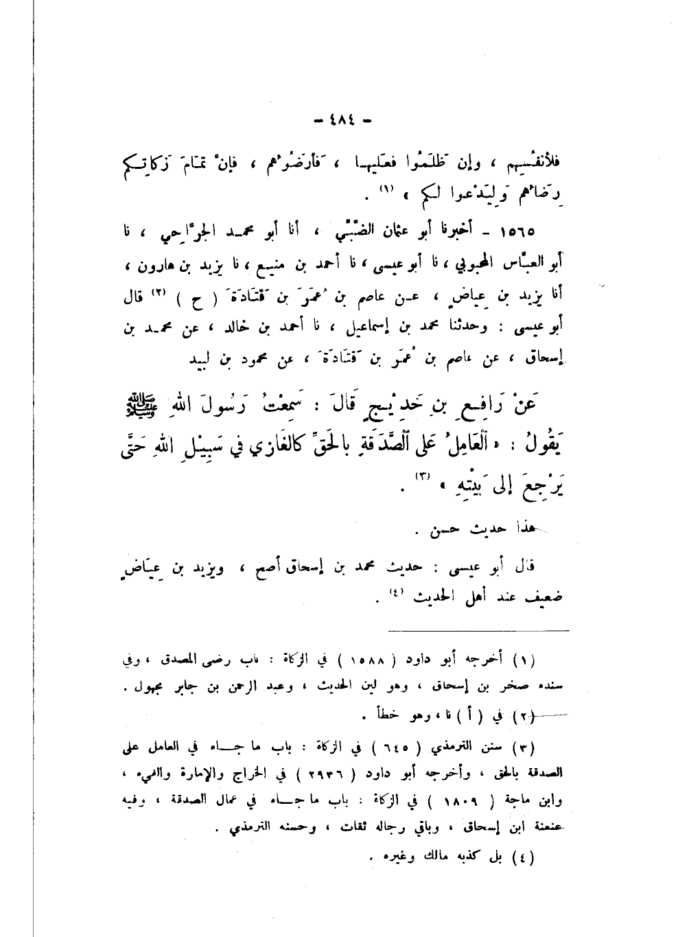 ح قَالَ أَبُو عِيسَى: وَحَدَّثَنَا مُحَمَّدُ بْنُ إِسْمَاعِيلَ، نَا أَحْمَدُ بْنُ خَالِدٍ، عَنْ مُحَمَّدِ بْنِ إِسْحَاقَ، عَنْ عَاصِمِ بْنِ عُمَرَ بْنِ قَتَادَةَ، عَنْ مَحْمُودِ بْنِ لَبِيدٍ، عَنْ رَافِعِ بْنِ خَدِيجٍ، قَالَ: سَمِعْتُ رَسُولَ اللَّهِ صَلَّى اللهُ عَلَيْهِ وَسَلَّمَ، يَقُولُ: «الْعَامِلُ عَلَى الصَّدَقَةِ بِالْحَقِّ كَالْغَازِي فِي سَبِيلِ اللَّهِ حَتَّى يَرْجِعَ إِلَى بَيْتِهِ».