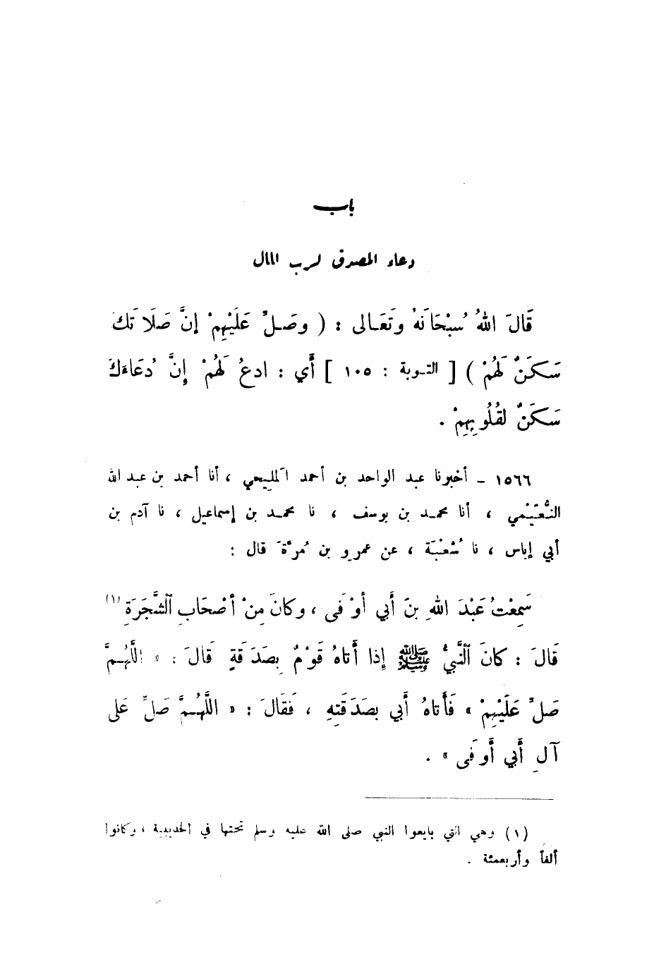 1566 - أَخْبَرَنَا عَبْدُ الْوَاحِدِ بْنُ أَحْمَدَ الْمَلِيحِيُّ، أَنا أَحْمَدُ بْنُ عَبْدِ اللَّهِ النُّعَيْمِيُّ، أَنا مُحَمَّدُ بْنُ يُوسُفَ، نَا مُحَمَّدُ بْنُ إِسْمَاعِيلَ، نَا آدَمُ بْنُ أَبِي إِيَاسٍ، نَا شُعْبَةُ، عَنْ عَمْرِو بْنِ مُرَّةَ، قَالَ: سَمِعْتُ عَبْدَ اللَّهِ بْنَ أَبِي أَوْفَى، وَكَانَ مِنْ أَصْحَابِ الشَّجَرَةِ، قَالَ: كَانَ النَّبِيُّ صَلَّى اللهُ عَلَيْهِ وَسَلَّمَ إِذَا أَتَاهُ قَوْمٌ بِصَدَقَةٍ، قَالَ: «اللَّهُمَّ صَلِّ عَلَيْهِمْ» فَأَتَاهُ أَبِي بِصَدَقَتِهِ، فَقَالَ: «اللَّهُمَّ صَلِّ عَلَى آلِ أَبِي أَوْفَى».