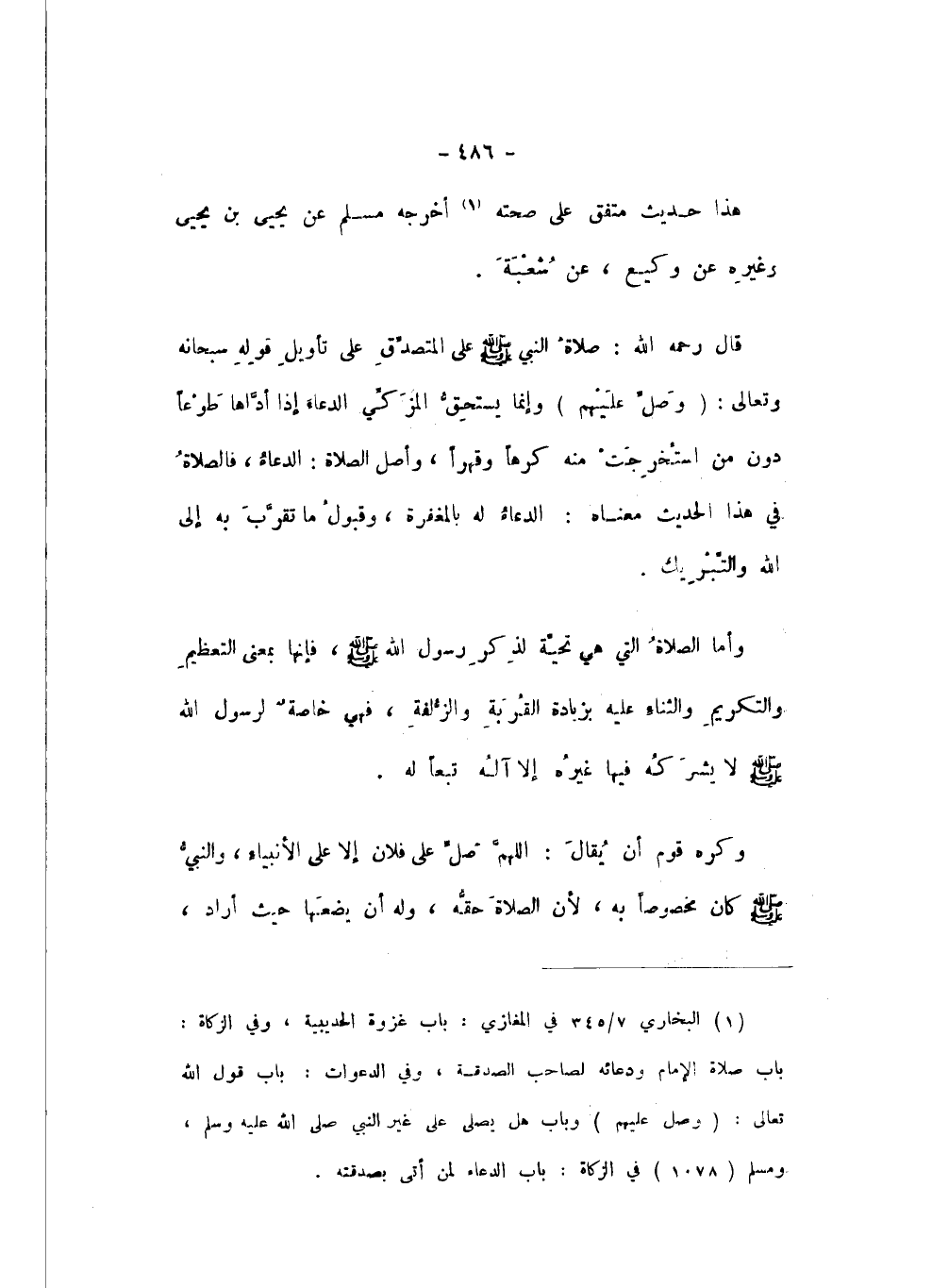 قَالَ رَحِمَهُ اللَّهُ: صَلاةُ النَّبِيِّ صَلَّى اللهُ عَلَيْهِ وَسَلَّمَ عَلَى الْمُتَصَدِّقِ عَلَى تَأْوِيلِ قَوْلِهِ سُبْحَانَهُ وَتَعَالَى: {وَصَلِّ عَلَيْهِمْ} [التَّوْبَة: 103] وَإِنَّمَا يَسْتَحِقُّ الْمُزَكِّي الدُّعَاءَ إِذَا أَدَّاهَا طَوْعًا دُونَ مَنِ اسْتُخْرِجَتْ مِنْهُ كَرْهًا وَقَهْرًا، وَأَصْلُ الصَّلاةِ الدُّعَاءُ، فَالصَّلاةُ فِي هَذَا الْحَدِيثِ مَعْنَاهُ الدُّعَاءُ لَهُ بِالْمَغْفِرَةِ، وَقَبُولُ مَا تَقَرَّبَ بِهِ إِلَى اللَّهِ وَالتَّبْرِيكِ.