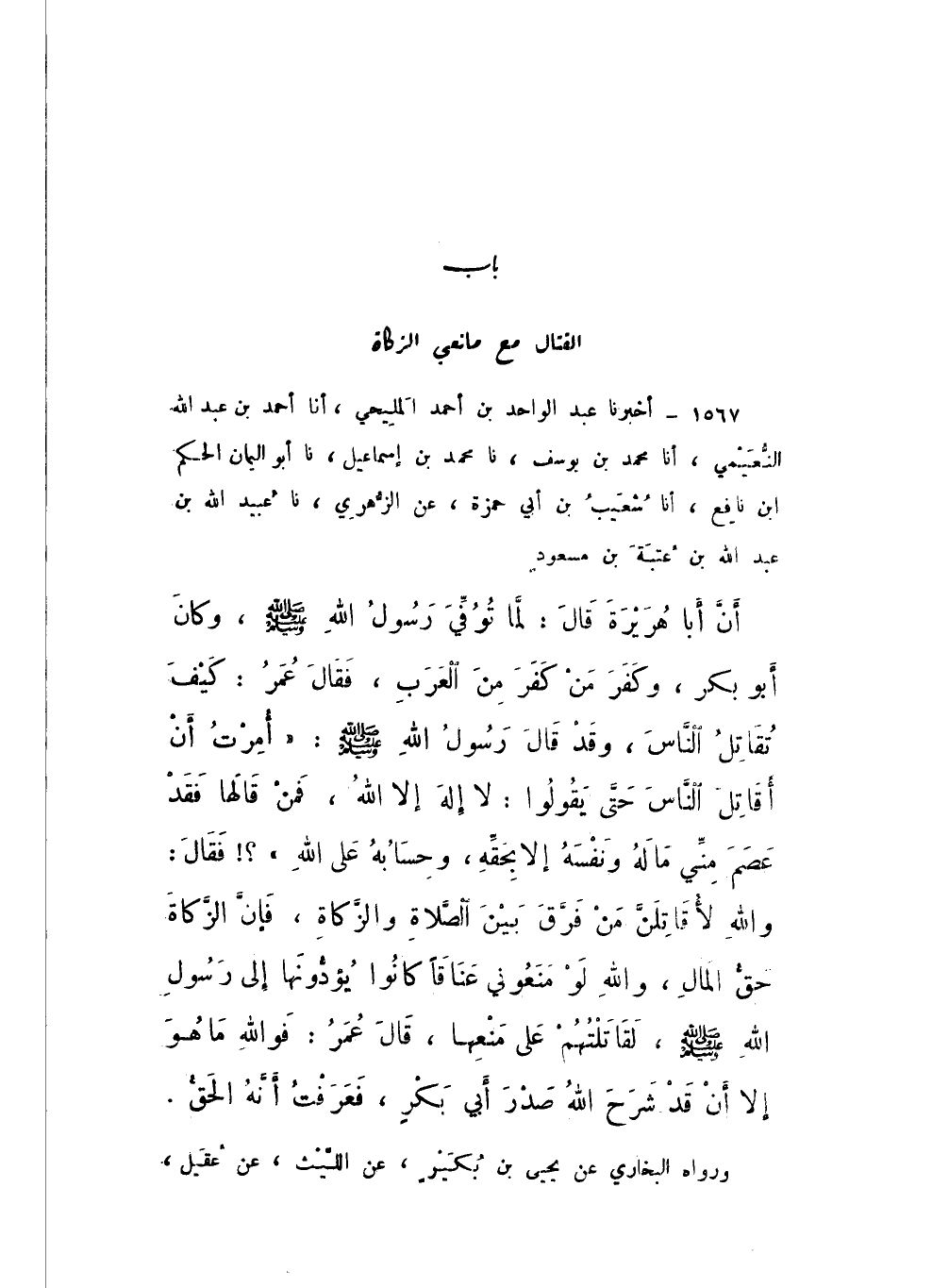 1567 - أَخْبَرَنَا عَبْدُ الْوَاحِدِ بْنُ أَحْمَدَ الْمَلِيحِيُّ، أَنا أَحْمَدُ بْنُ عَبْدِ اللَّهِ النُّعَيْمِيُّ، أَنا مُحَمَّدُ بْنُ يُوسُفَ، نَا مُحَمَّدُ بْنُ إِسْمَاعِيلَ، نَا أَبُو الْيَمَانِ الْحَكَمُ بْنُ نَافِعٍ، أَنا شُعَيْبُ بْنُ أَبِي حَمْزَةَ، عَنِ الزُّهْرِيِّ، نَا عُبَيْدُ اللَّهِ بْنُ عَبْدِ اللَّهِ بْنِ عُتْبَةَ بْنِ مَسْعُودٍ، أَنَّ أَبَا هُرَيْرَةَ، قَالَ: لَمَّا تُوُفِّيَ رَسُولُ اللَّهِ صَلَّى اللهُ عَلَيْهِ وَسَلَّمَ، وَكَانَ أَبُو بَكْرٍ، وَكَفَرَ مِنَ الْعَرَبِ، فَقَالَ عُمَرُ: كَيْفَ تُقَاتِلُ النَّاسَ، وَقَدْ قَالَ رَسُولُ اللَّهِ صَلَّى اللهُ عَلَيْهِ وَسَلَّمَ: " أُمِرْتُ أَنْ أُقَاتِلَ النَّاسَ حَتَّى يَقُولُوا: لَا إِلَهَ إِلا اللَّهُ، فَمَنْ قَالَهَا فَقَدْ عَصَمَ مِنِّي مَالَهُ وَنَفْسَهُ إِلا بِحَقِّهِ، وَحِسَابُهُ عَلَى اللَّهِ " فَقَالَ: وَاللَّهِ لأُقَاتِلَنَّ مَنْ فَرَّقَ بَيْنَ الصَّلاةِ وَالزَّكَاةِ، فَإِنَّ الزَّكَاةَ حَقُّ الْمَالِ، وَاللَّهِ لَوْ مَنْعُونِي عَنَاقًا كَانُوا يُؤدُّونَهَا إِلَى رَسُولِ اللَّهِ صَلَّى اللهُ عَلَيْهِ وَسَلَّمَ، لَقَاتَلْتُهُمْ عَلَى مَنْعِهَا، قَالَ عُمَرُ: فَوَاللَّهِ مَا هُوَ إِلا أَنْ قَدْ شَرَحَ اللَّهُ صَدْرَ أَبِي بَكْرٍ، فَعَرَفْتُ أَنَّهُ الْحَقَّ.