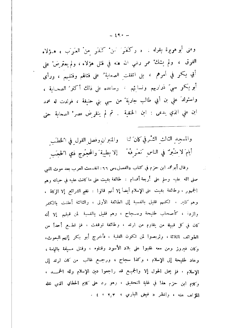 وَعَنَى أَبُو هُرَيْرَةَ بِقَوْلِهِ: «وَكَفَرَ مَنْ كَفَرَ مِنَ الْعَرَبِ» هَؤُلاءِ الْفِرَقُ، وَلَمْ يَشُكَّ عُمَرُ رَضِيَ اللَّهُ عَنْهُ فِي قَتْلِ هَؤُلاءِ، وَلَمْ يَعْتَرِضْ عَلَى أَبِي بَكْرٍ فِي أَمْرِهِمْ، بَلِ اتَّفَقَتِ الصَّحَابَةُ عَلَى قِتَالِهِمْ وَقَتْلِهِمْ، وَرَأَى أَبُو بَكْرٍ سَبْيَ ذَرَارِيهِمْ وَنِسَائِهِمْ، وَسَاعَدَهُ عَلَى ذَلِكَ أَكْثَرُ الصَّحَابَةِ، وَاسْتَوْلَدَ عَلِيُّ بْنُ أَبِي طَالِبٍ جَارِيَةً مِنْ سَبْيِ بَنِي حَنِيفَةَ، فَوَلَدَتْ لَهُ مُحَمَّدُ بْنُ عَلِيٍّ الَّذِي يُدْعَى: ابْنَ الْحَنَفِيَّةِ.