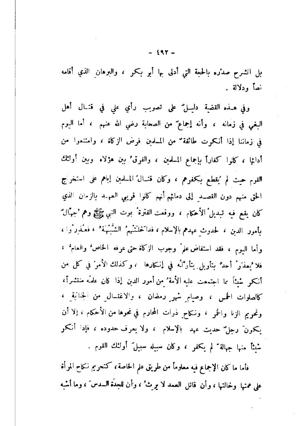 وَفِي هَذِهِ الْقَضِيَّةِ دَلِيلٌ عَلَى تَصْوِيبِ رَأْيِ عَلِيٍّ فِي قِتَالِ أَهْلِ الْبَغْيِ فِي زَمَانِهِ، وَأَنَّهُ إِجْمَاعٌ مِنَ الصَّحَابَةِ رَضِيَ اللَّهُ عَنْهُمْ، أَمَّا الْيَوْمَ فِي زَمَانِنَا إِذَا أَنْكَرَتْ طَائِفَةٌ مِنَ الْمُسْلِمِينَ فَرْضَ الزَّكَاةِ، وَامْتَنَعُوا مِنْ أَدَائِهَا، كَانُوا كُفَّارًا بِإِجْمَاعِ الْمُسْلِمِينَ، وَالْفَرْقُ بَيْنَ هَؤُلاءِ وَبَيْنَ أُولَئِكَ الْقَوْمِ حَيْثُ لَمْ يُقْطَعْ بِكُفْرِهِمْ، وَكَانَ قِتَالُ الْمُسْلِمِينَ إِيَّاهُمْ عَلَى اسْتِخْرَاجِ الْحَقِّ مِنْهُمْ دُونَ الْقَصْدِ إِلَى دِمَائِهِمْ، أَنَّهُمْ كَانُوا قَرِيبِي الْعَهْدِ بِالزَّمَانِ الَّذِي كَانَ يَقَعُ فِيهِ تَبْدِيلُ الأَحْكَامِ، وَوَقَعَتِ الْفَتْرَةُ بِمَوْتِ النَّبِيِّ صَلَّى اللهُ عَلَيْهِ وَسَلَّمَ وَهُمْ جُهَّالٌ بِأُمُورِ الدِّينِ، لِحُدُوثِ عَهْدِهِمْ بِالإِسْلامِ، فَدَاخَلَتْهُمُ الشُّبْهَةُ، فَعُذِرُوا، وَأَمَّا الْيَوْمَ، فَقَدِ اسْتَفَاضَ عِلْمُ وُجُوبِ الزَّكَاةِ حَتَّى عَرَفَهُ الْخَاصُّ وَالْعَامُّ، فَلا يُعْذَرُ أَحَدٌ بِتَأْوِيلٍ يَتَأَوَّلُهُ فِي إِنْكَارِهَا، وَكَذَلِكَ الأَمْرُ فِي كُلِّ مَنْ أَنْكَرَ شَيْئًا مِمَّا اجْتَمَعَتْ عَلَيْهِ الأُمَّةُ مِنْ أُمُورِ الدِّينِ إِذَا كَانَ عِلْمُهُ مُنْتَشِرًا، كَالصَّلَوَاتِ الْخَمْسِ، وَصِيَامِ شَهْرِ رَمَضَانَ، وَالاغْتِسَالِ مِنَ الْجَنابَةِ، وَتَحْرِيمِ الزِّنَا وَالْخَمْرِ، وَنِكَاحِ ذَوَاتِ الْمَحَارِمِ فِي نَحْوِهَا مِنَ الأَحْكَامِ، إِلا أَنْ يَكُونَ رَجُلٌ حَدِيثَ عَهْدٍ بِالإِسْلامِ، وَلا يَعْرِفُ حُدُودَهُ، فَإِذَا أَنْكَرَ شَيْئًا مِنْهَا جَهَالَةً لَمْ يَكْفُرْ، وَكَانَ سَبِيلُهُ سَبِيلَ أُولَئِكَ الْقَوْمِ.