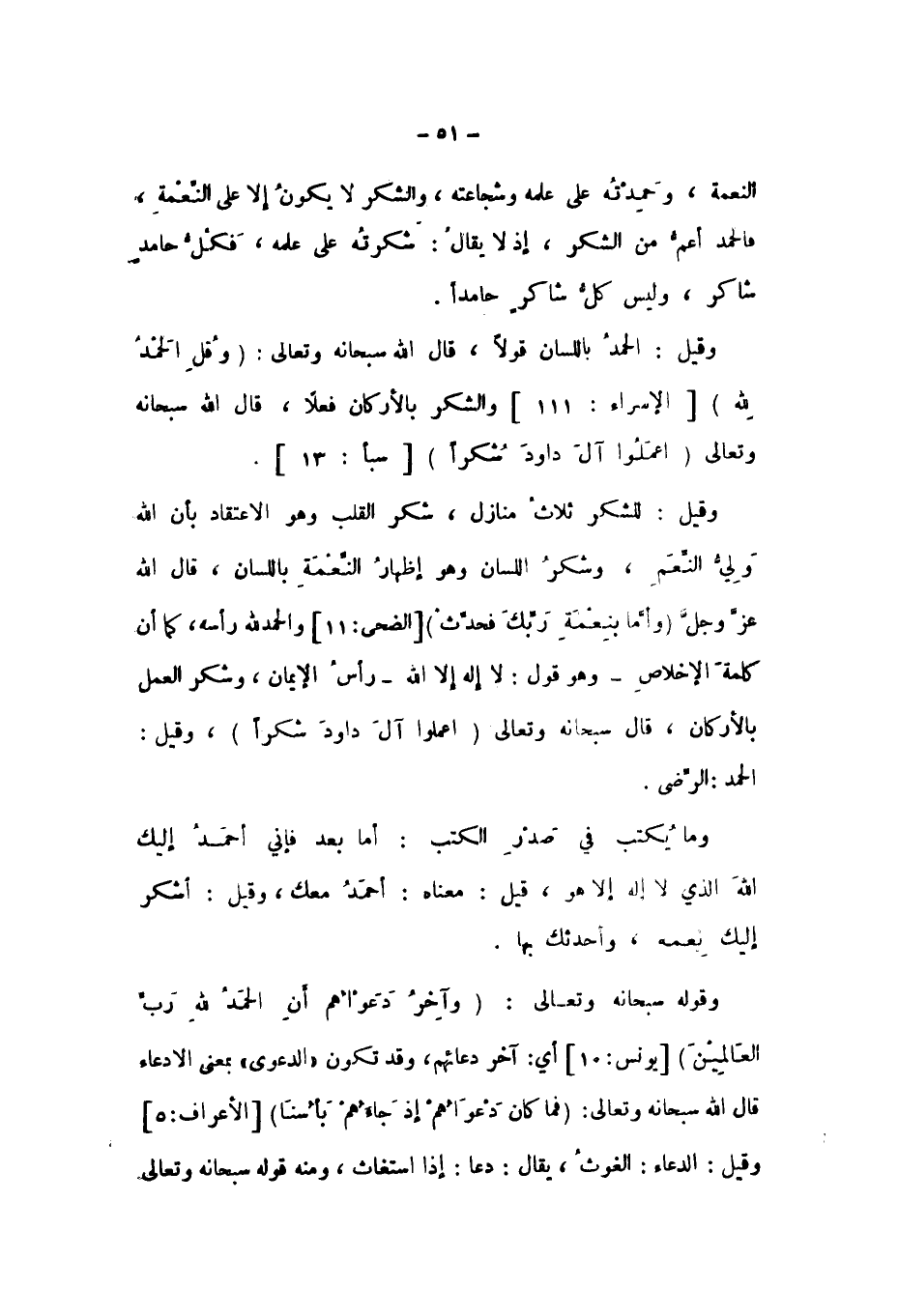 وَقِيلَ: لِلشُّكْرِ ثَلاثُ مَنَازِلَ: شُكْرُ الْقَلْبِ، وَهُوَ الاعْتِقَادُ بِأَنَّ اللَّهَ وَلِيُّ النِّعَمِ، وَشُكْرُ اللِّسَانِ، وَهُوَ إِظْهَارُ النِّعْمَةِ بِاللِّسَانِ، قَالَ اللَّهُ عَزَّ وَجَلَّ: {وَأَمَّا بِنِعْمَةِ رَبِّكَ فَحَدِّثْ} [الضُّحَى: 11] وَالْحَمْدُ لِلَّهِ رَأْسُهُ، كَمَا أَنَّ كَلِمَةَ الإِخْلاصِ، وَهُوَ قَوْلُ: لَا إِلَهَ إِلا اللَّهُ، رَأْسُ الإِيمَانِ، وَشُكْرُ الْعَمَلِ بِالأَرْكَانِ، قَالَ سُبْحَانَهُ وَتَعَالَى: {اعْمَلُوا آلَ دَاوُدَ شُكْرًا} [سبأ: 13]، وَقِيلَ: الْحَمْدُ: الرِّضَا.