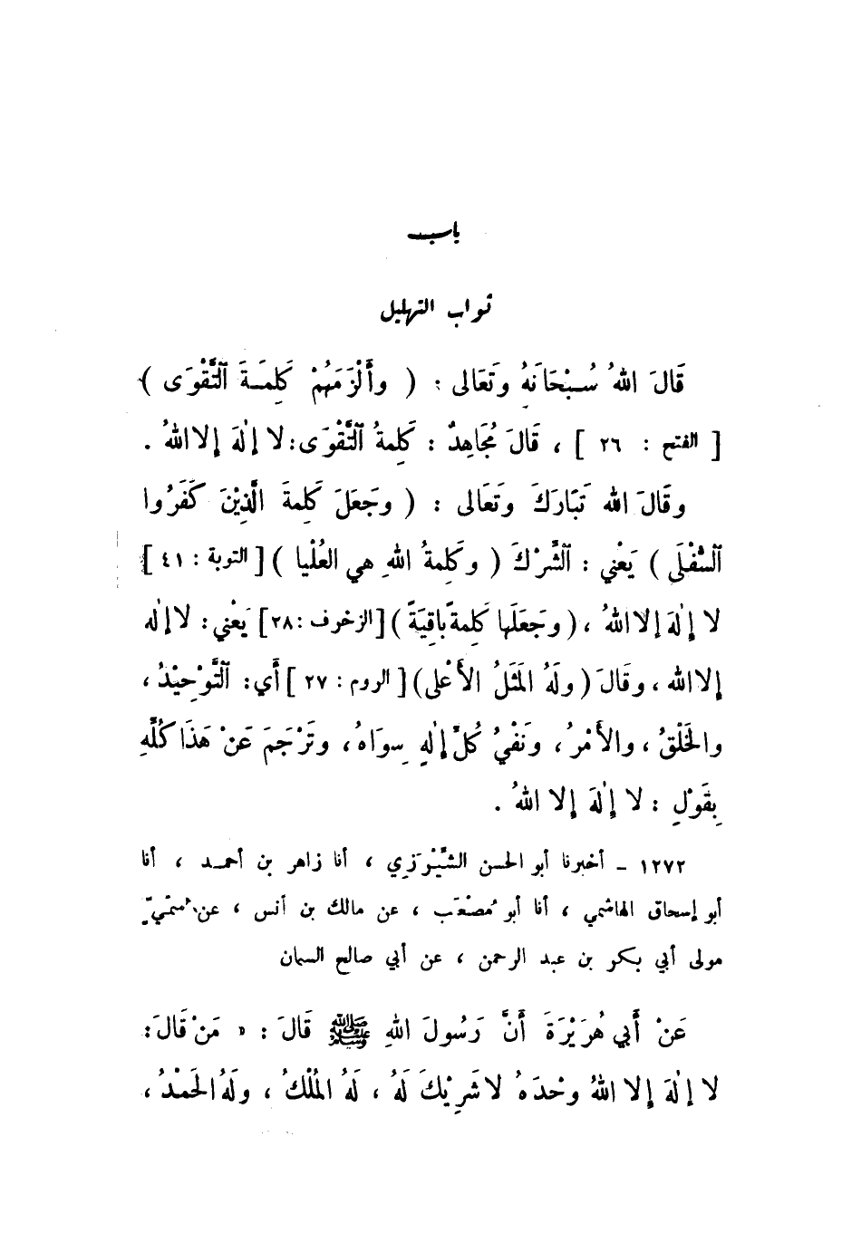 وَقَالَ اللَّهُ تَبَارَكَ وَتَعَالَى: {وَجَعَلَ كَلِمَةَ الَّذِينَ كَفَرُوا السُّفْلَى} [التَّوْبَة: 40] يَعْنِي الشِّرْكَ {وَكَلِمَةُ اللَّهِ هِيَ الْعُلْيَا} [التَّوْبَة: 40] لَا إِلَهَ إِلا اللَّهُ، {وَجَعَلَهَا كَلِمَةً بَاقِيَةً} [الزخرف: 28] يَعْنِي لَا إِلَهَ إِلا اللَّهُ، وَقَالَ: {وَلَهُ الْمَثَلُ الأَعْلَى} [الرّوم: 27] أَيِ: التَّوْحِيدُ، وَالْخَلْقُ، وَالأَمْرُ، وَنَفْيُ كُلِّ إِلَهٍ سِوَاهُ، وَتَرْجَمَ عَنْ هَذَا كُلِّهِ بِقَوْلِ: لَا إِلَهَ إِلا اللَّهُ.