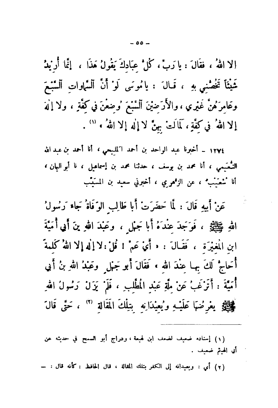 1274 - أَخْبَرَنَا عَبْدُ الْوَاحِدِ بْنُ أَحْمَدَ الْمَلِيحِيُّ، أَنا أَحْمَدُ بْنُ عَبْدِ اللَّهِ النُّعَيْمِيُّ، أَنا مُحَمَّدُ بْنُ يُوسُفَ، حَدَّثَنَا مُحَمَّدُ بْنُ إِسْمَاعِيلَ، نَا أَبُو الْيَمَانِ، أَنا شُعَيْبٌ، عَنِ الزُّهْرِيِّ، أَخْبَرَنِي سَعِيدُ بْنُ الْمُسَيِّبِ، عَنْ أَبِيهِ، قَالَ: لَمَّا حَضَرَتْ أَبَا طَالِبٍ الْوَفَاةُ جَاءَ رَسُولُ اللَّهِ صَلَّى اللهُ عَلَيْهِ وَسَلَّمَ، فَوَجَدَ عِنْدَهُ أَبَا جَهْلٍ، وَعَبْدَ اللَّهِ بْنَ أَبِي أُمَيَّةَ بْنِ الْمُغِيرَةِ، فَقَالَ: " أَيْ عَمِّ، قُلْ: لَا إِلَهَ إِلا اللَّهُ كَلِمَةً أُحَاجُّ لَكَ بِهَا عِنْدَ اللَّهِ ".