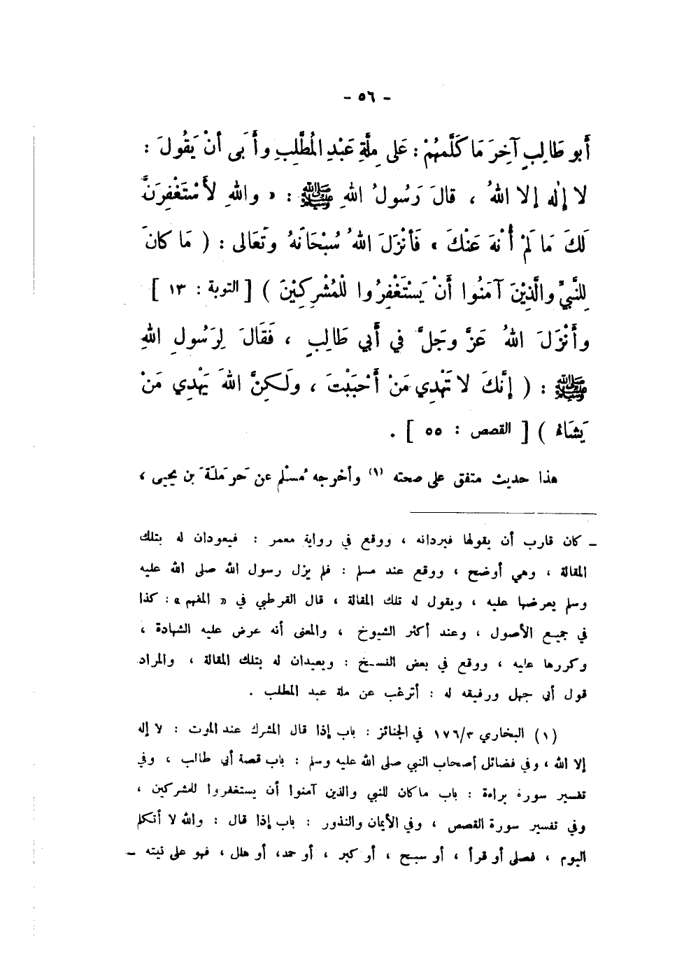 أَبُو طَالِبٍ آخِرَ مَا كَلَّمَهُمْ: عَلَى مِلَّةِ عَبْدِ الْمُطَّلِبِ.