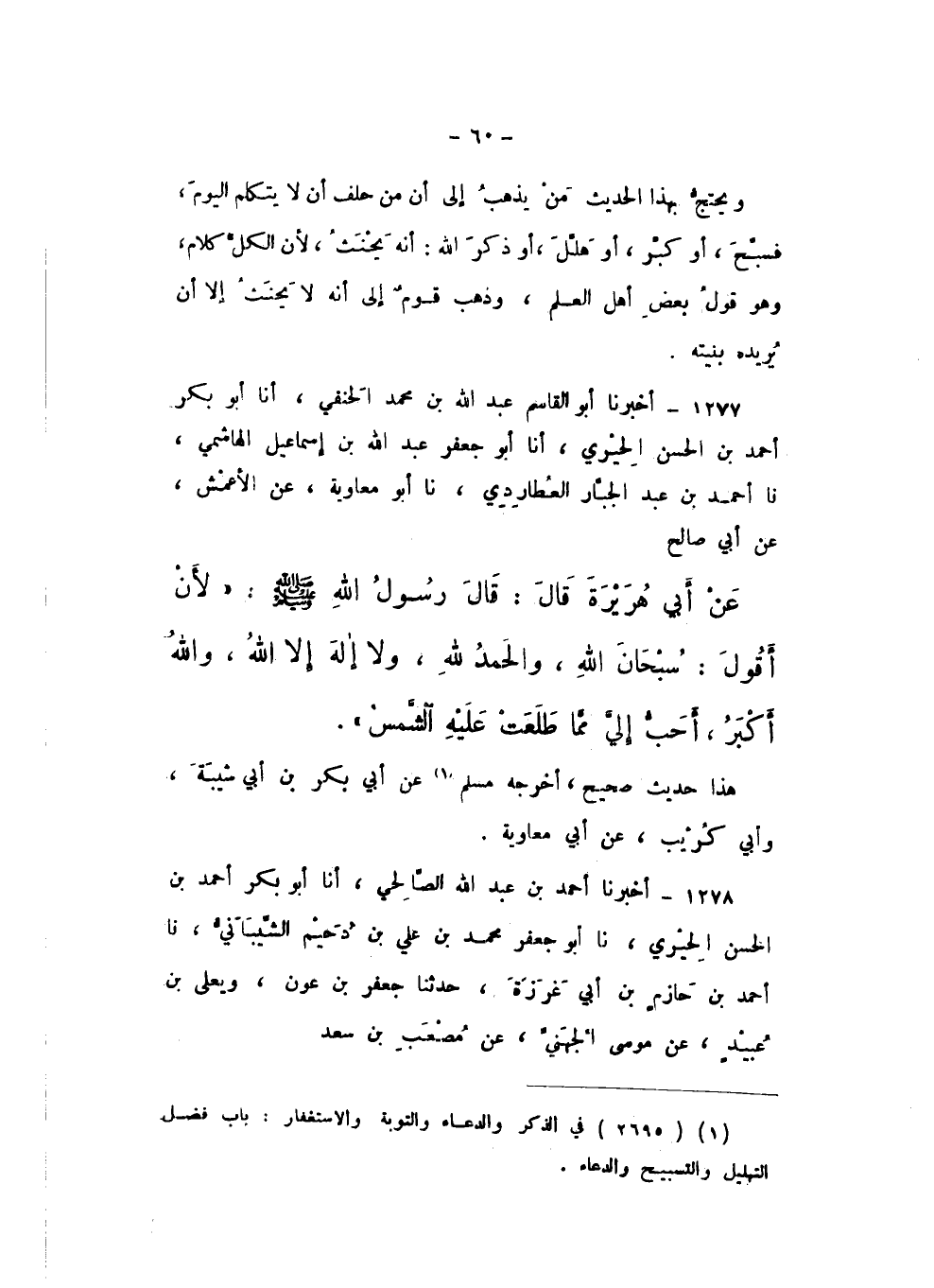1277 - أَخْبَرَنَا أَبُو الْقَاسِمِ عَبْدُ اللَّهِ بْنُ مُحَمَّدٍ الْحَنَفِيُّ، أَنا أَبُو بَكْرٍ أَحْمَدُ بْنُ الْحَسَنِ الْحِيرِيُّ، أَنا أَبُو جَعْفَرٍ عَبْدُ اللَّهِ بْنُ إِسْمَاعِيلَ الْهَاشِمِيُّ، نَا أَحْمَدُ بْنُ عَبْدِ الْجَبَّارِ الْعُطَارِدِيُّ، نَا أَبُو مُعَاوِيَةَ، عَنِ الأَعْمَشِ، عَنْ أَبِي صَالِحٍ، عَنْ أَبِي هُرَيْرَةَ، قَالَ: قَالَ رَسُولُ اللَّهِ صَلَّى اللهُ عَلَيْهِ وَسَلَّمَ: " لأَنْ أَقُولَ: سُبْحَانَ اللَّهِ، وَالْحَمْدُ لِلَّهِ، وَلا إِلَهَ إِلا اللَّهُ، وَاللَّهُ أَكْبَرُ، أَحَبُّ إِلَيَّ مِمَّا طَلَعَتْ عَلَيْهِ الشَّمْسُ ".