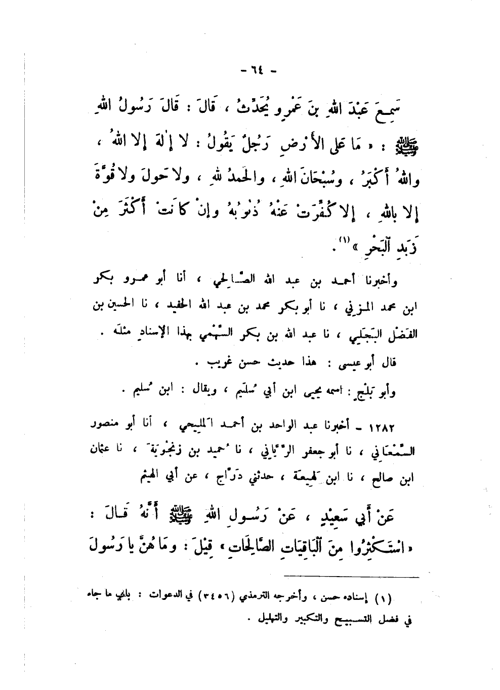 1282 - أَخْبَرَنَا عَبْدُ الْوَاحِدِ بْنُ أَحْمَدَ الْمَلِيحِيُّ، أَنا أَبُو مَنْصُورٍ السَّمْعَانِيُّ، نَا أَبُو جَعْفَرٍ الرَّيَّانِيُّ، نَا حُمَيْدُ بْنُ زَنْجُوَيْهِ، نَا عُثْمَانُ بْنُ صَالِحٍ، نَا ابْنُ لَهِيعَةَ، حَدَّثَنِي دَرَّاجٌ، عَنْ أَبِي الْهَيْثَمِ، عَنْ أَبِي سَعِيدٍ، عَنْ رَسُولِ اللَّهِ صَلَّى اللهُ عَلَيْهِ وَسَلَّمَ، أَنَّهُ قَالَ: «اسْتَكْثِرُوا مِنَ الْبَاقِيَاتِ الصَّالِحَاتِ».