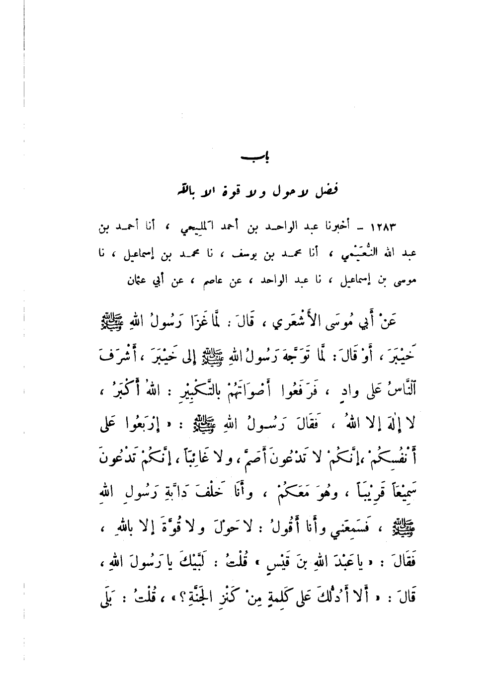 1283 - أخبرنَا عَبْدُ الْوَاحِدِ بْنُ أَحْمَدَ الْمَلِيحِيُّ، أَنا أَحْمَدُ بْنُ عَبْدِ اللَّهِ النُّعَيْمِيُّ، أَنا مُحَمَّدُ بْنُ يُوسُفَ، نَا مُحَمَّدُ بْنُ إِسْمَاعِيلَ، نَا مُوسَى بْنُ إِسْمَاعِيلَ، نَا عَبْدُ الْوَاحِدِ، عَنْ عَاصِمٍ، عَنْ أَبِي عُثْمَانَ، عَنْ أَبِي مُوسَى الأَشْعَرِيِّ، قَالَ: لَمَّا غَزَا رَسُولُ اللَّهِ صَلَّى اللهُ عَلَيْهِ وَسَلَّمَ خَيْبَرَ، أَوْ قَالَ: لَمَّا تَوَجَّهَ رَسُولُ اللَّهِ صَلَّى اللهُ عَلَيْهِ وَسَلَّمَ إِلَى خَيْبَرَ، أَشْرَفَ النَّاسُ عَلَى وَادٍ، فَرَفَعُوا أَصْوَاتَهُمْ بِالتَّكْبِيرِ: اللَّهُ أَكْبَرُ، لَا إِلَهَ إِلا اللَّهُ، فَقَالَ رَسُولُ اللَّهِ صَلَّى اللهُ عَلَيْهِ وَسَلَّمَ: «ارْبَعُوا عَلَى أَنْفُسِكُمْ، إِنَّكُمْ لَا تَدْعُونَ أَصَمَّ، وَلا غَائِبًا، إِنَّكُمْ تَدْعُونَ سَمِيعًا قَرِيبًا، وَهُوَ مَعَكُمْ».